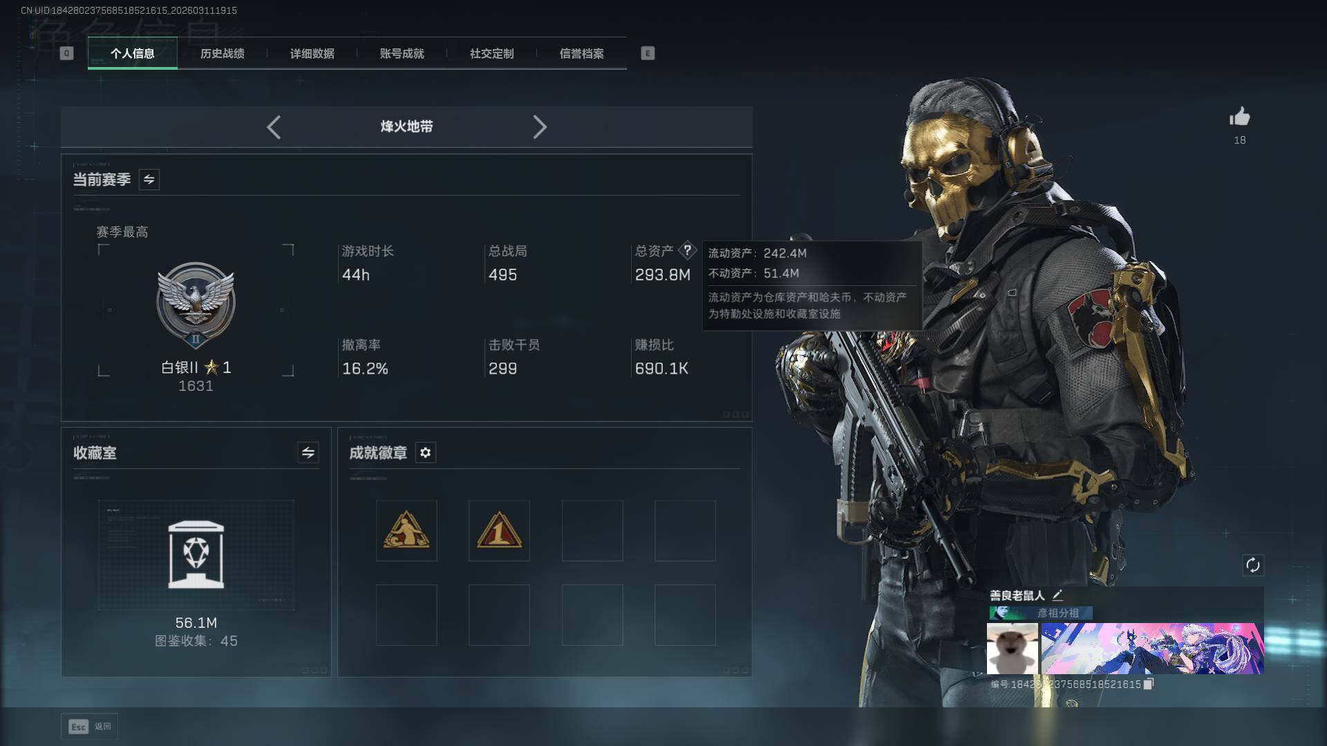 总资产(M):290M/哈夫币(K):2296K/传说枪皮数:10/全面战场等级:1_段位:无段位/烽火地带等级:60_段位:白银/