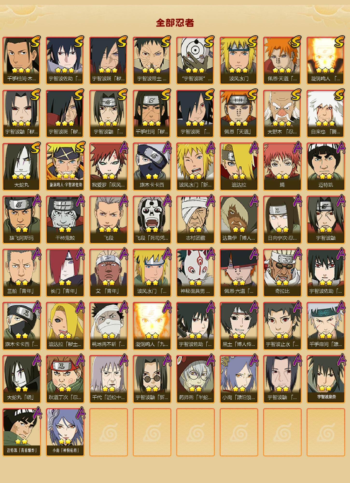 【S级忍者】:千手柱间「秽土转生」(3星),宇智波鼬「秽土转生」(3星),宇智波斑「秽土转生」(3星),宇智波斑「秽土转生·解」(3星),大野木「忍界大战」(3星),宇智波带土「忍界大战」(3星),宇智波鼬「须佐能乎」(3星),宇智波斑「木叶创立」(3星),千手柱间「木叶创立」(3星),自来也「舞之豪杰」(3星),大蛇丸(3星),波风水门(3星),漩涡鸣人「九喇嘛连结」(3星),佩恩「天道」(3星),佩恩·天道「超」(3星),宇智波佐助「永恒万花筒」(3星),宇智