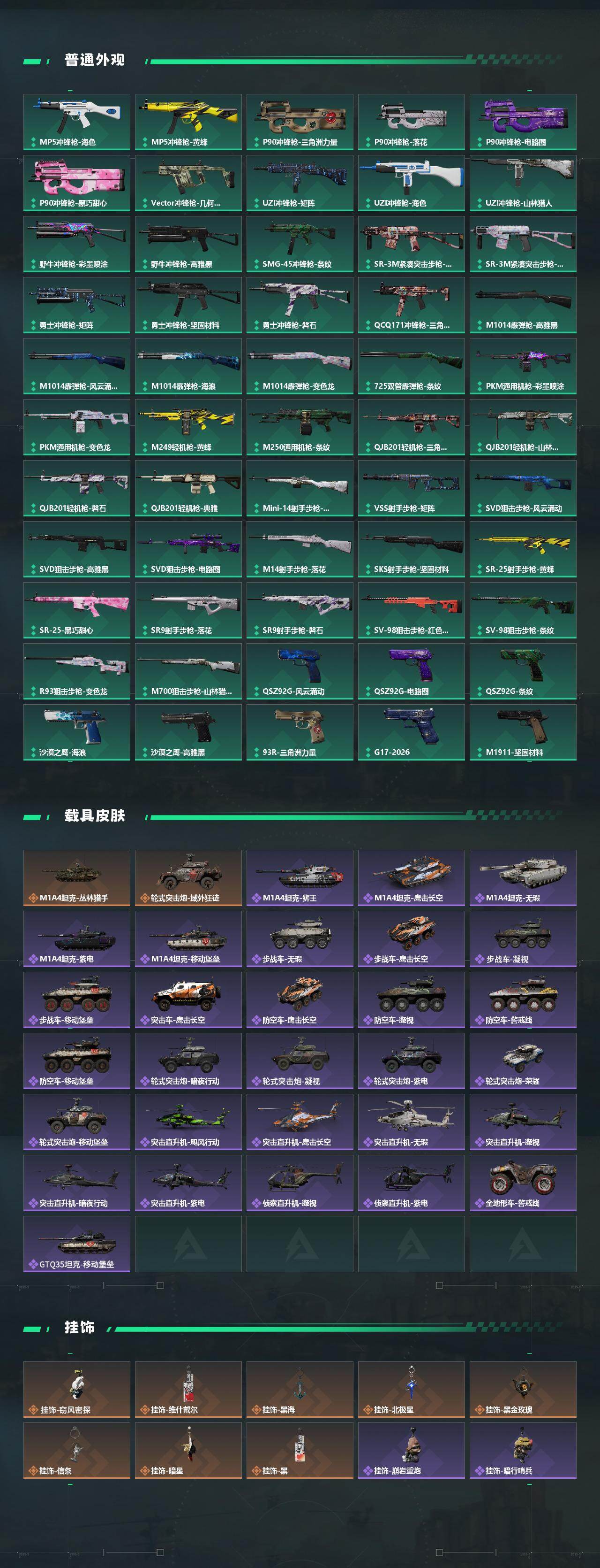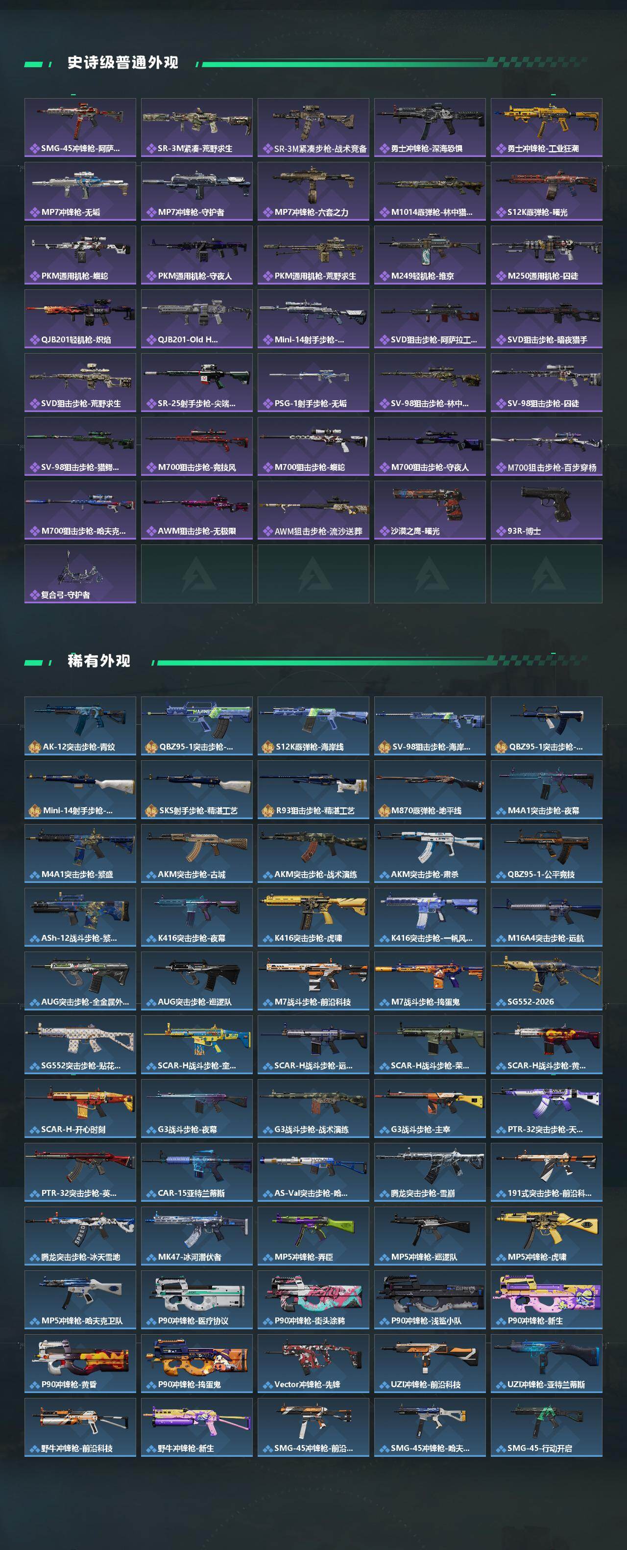 【传说外观】:M4A1突击步枪-蚀金玫瑰,M4A1突击步枪-阿米娅,ASh-12战斗步枪-鹅鸭杀,M7战斗步枪-维京,SG552突击步枪-运动员,AK-12突击步枪-夜鹰