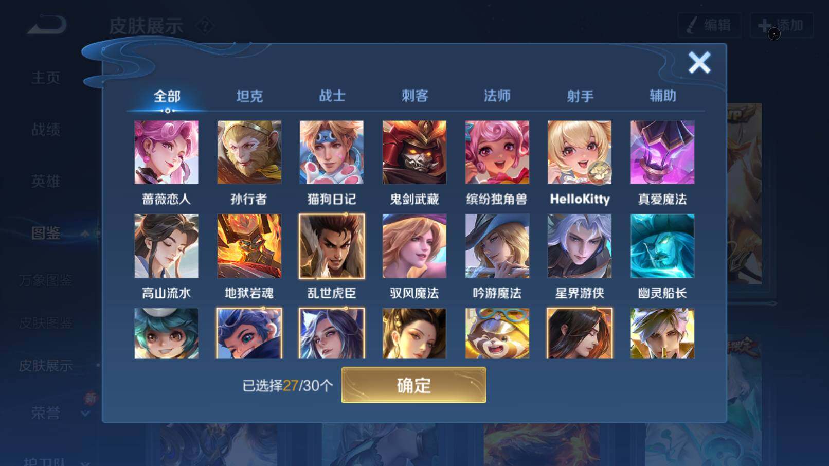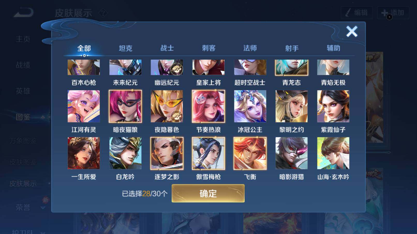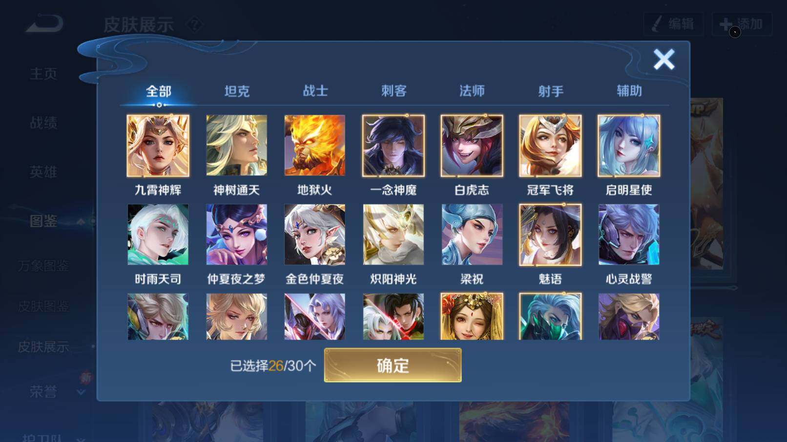 【限定皮肤】:白起狰,姜子牙天穹之誓,狄仁杰阴阳师,虞姬凯尔特女王,赵云皇家上将,赵云百木心枪,妲己时之彼端,嬴政优雅恋人,嬴政白昼王子,孙尚香蔷薇恋人,鲁班七号狮舞东方,庄周蜃楼王,庄周高山流水,钟无艳超时空战士,
