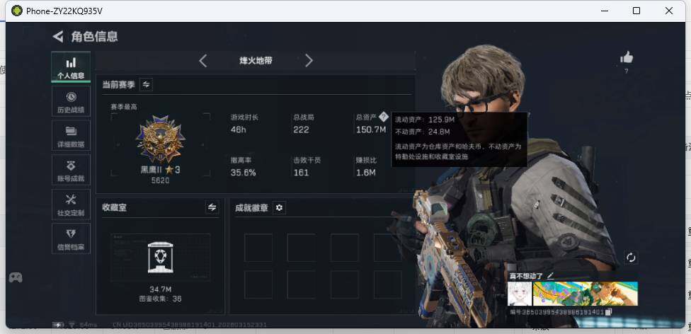 150m总资产-34768k哈伏币-60烽火等级-黑鹰-13战场等级-列兵