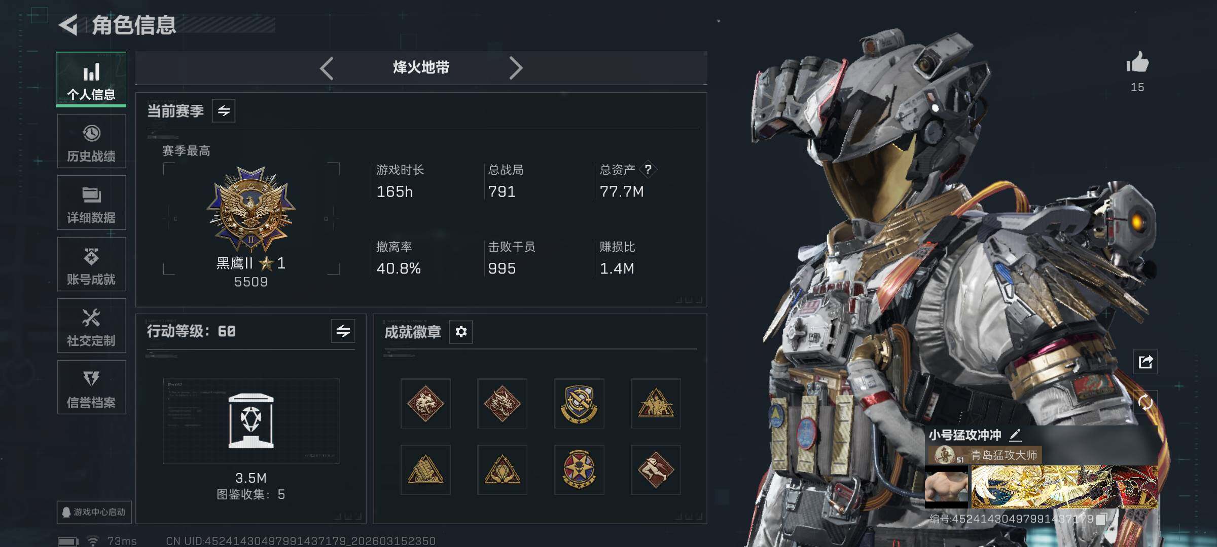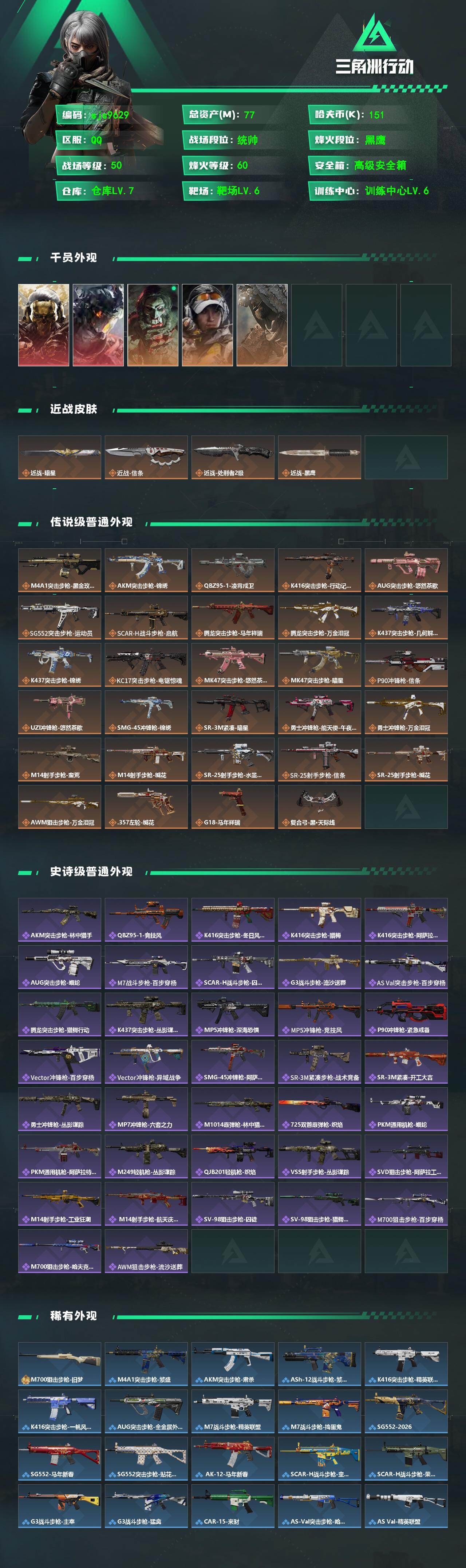 77m总资产-151k哈伏币-60烽火等级-黑鹰-50战场等级-统帅