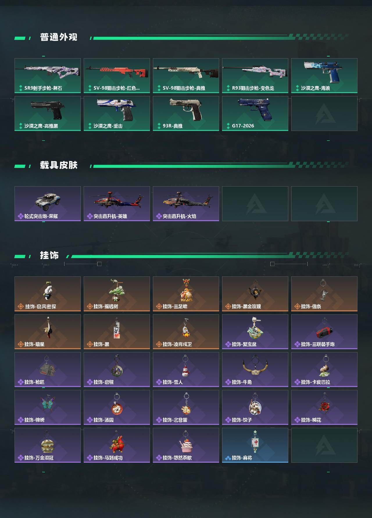【传说外观】:M4A1突击步枪-蚀金玫瑰,AKM突击步枪-锦绣,QBZ95-1突击步枪-凌霄戍卫,K416突击步枪-行动记录,AUG突击步枪-悠然茶歇,SG552突击步枪-运动员,SCA