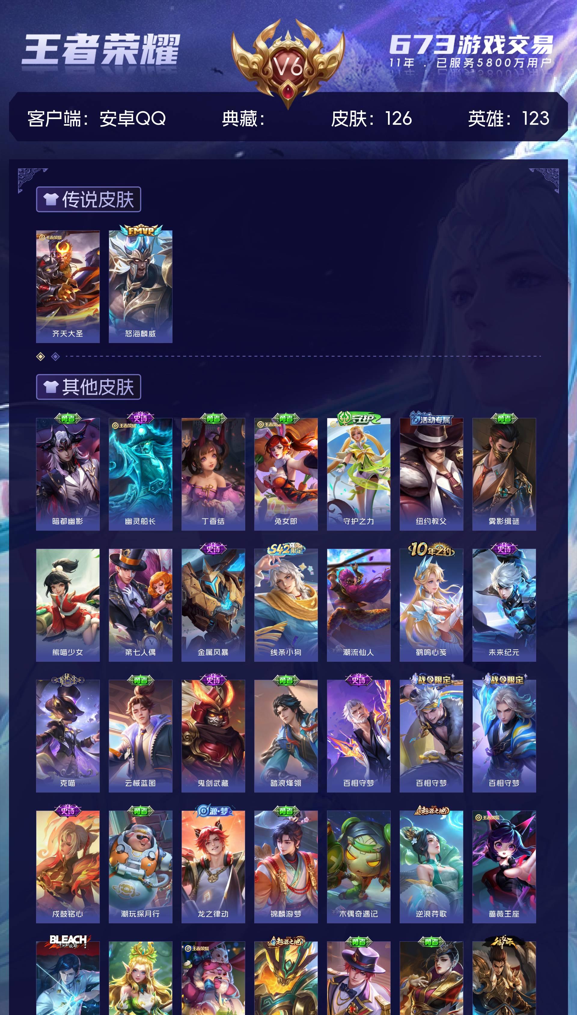 V6 皮肤126 英雄123 至尊星耀 传说2 其他皮肤131