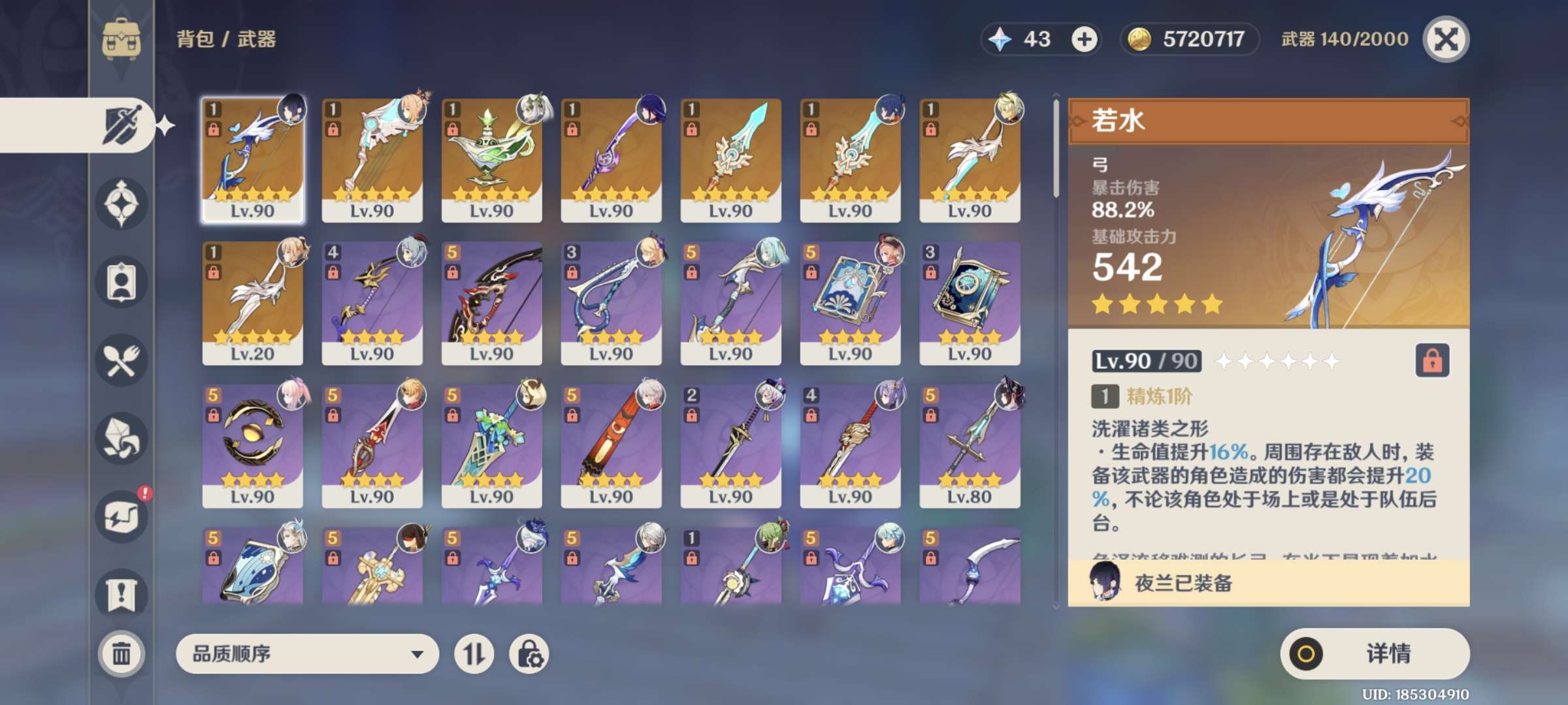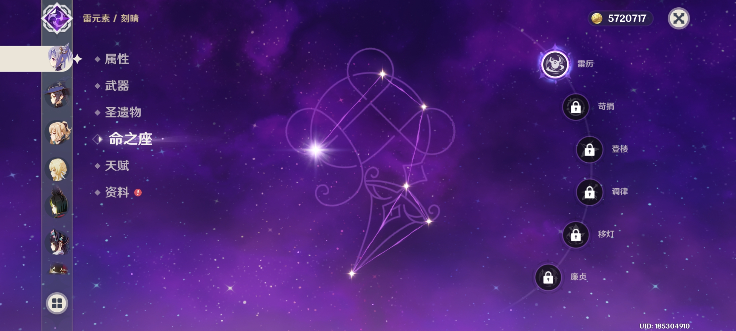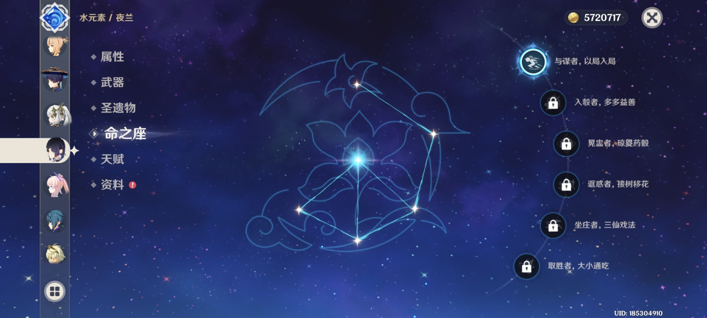 一命芙宁娜,1+1夜兰,0+1草神,0+1雷神,二命琴有龙王,钟离,仆人,流浪者,宵宫,珊瑚宫心海,