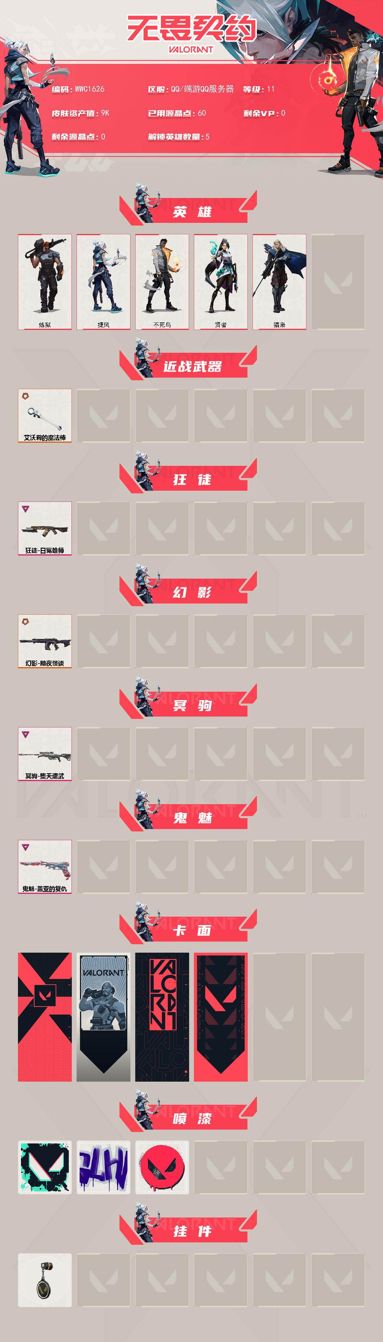 【WWC1626】终极*2/卓越*3/皮肤*5/等级*11/段位:未定级/炼狱/捷风/不死鸟/贤者/猎枭/近战武器-艾沃莉的魔法棒/狂徒-日冕雄师/幻影-黯夜怪谈/冥驹-堕天遗武/鬼魅-盖亚的复仇/代号红色 卡面/新兵报到 卡面/V契约 卡面/无畏契约 卡面/胜利属于无畏契约 喷漆/GLHF 喷漆/无畏契约 喷漆/无畏契约 纪念币 挂饰