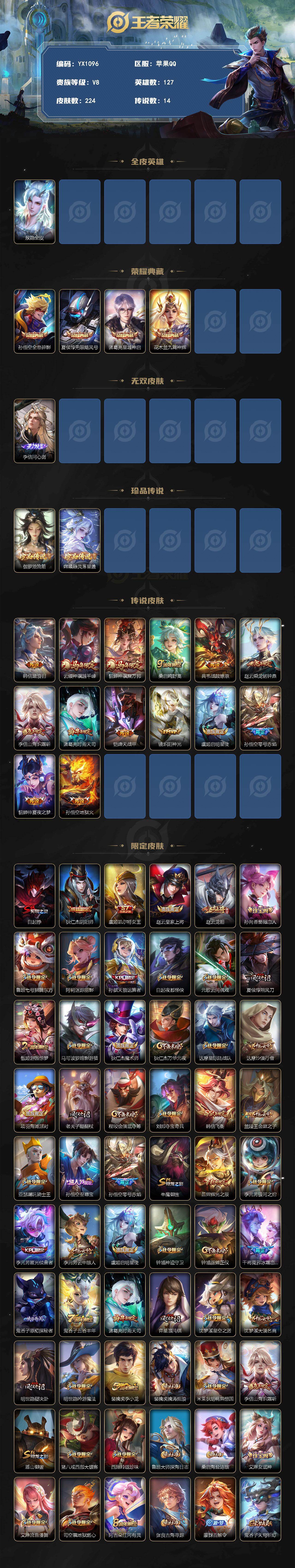 苹果Q-V8-224皮肤4典藏1无双2珍品传说14传说/问心剑/全息碎影/无限飓风号/九霄神辉/星域神启/沧流箭/器灵落星盏