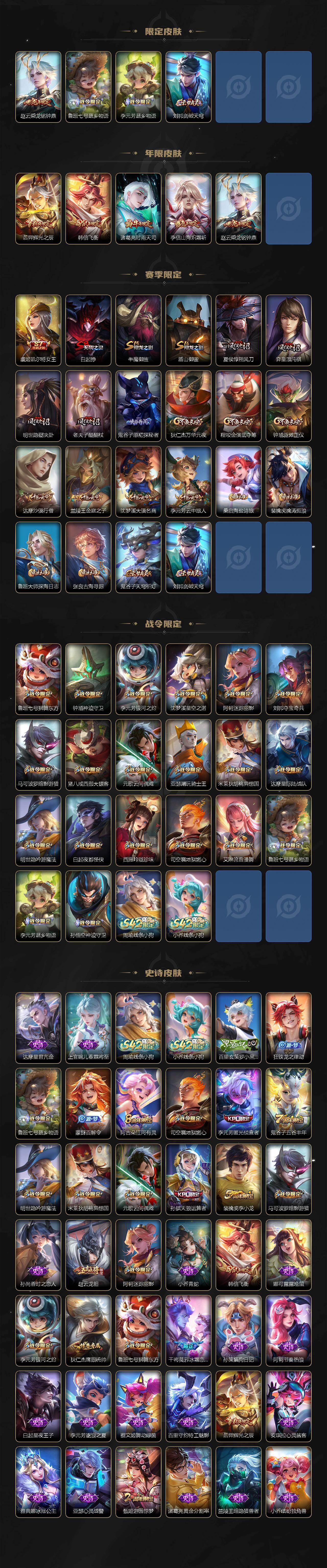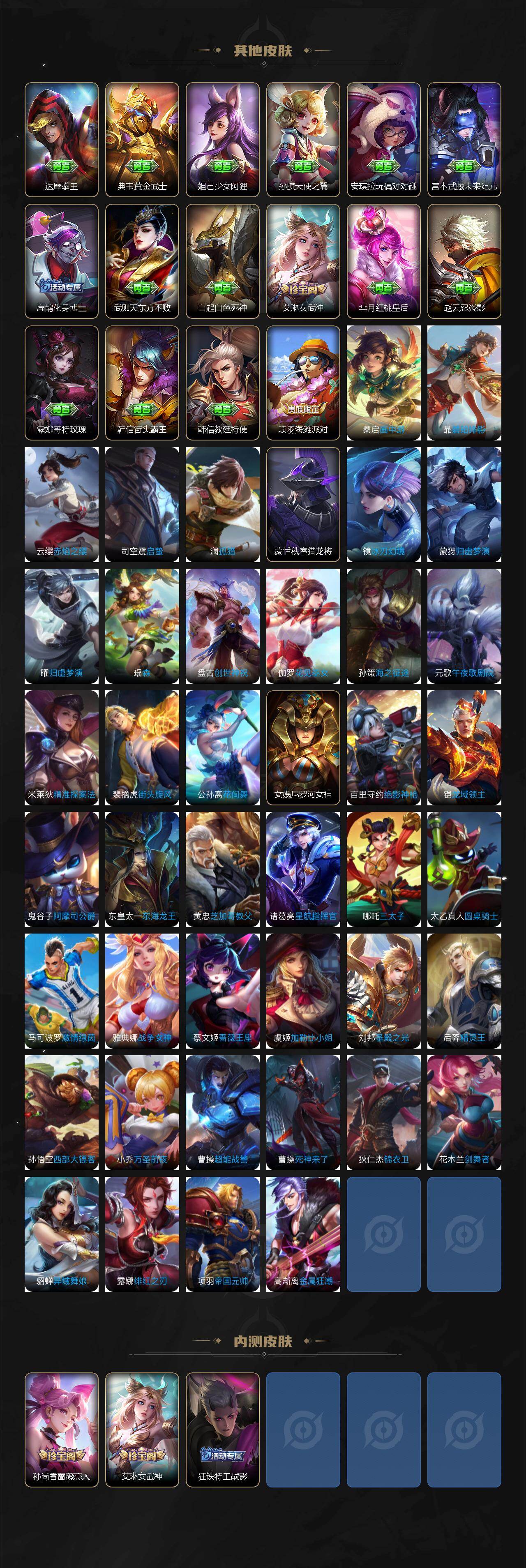 【传说皮肤】:韩信踏浪归,云缨神骥越千峰,貂蝉神骥聚万邦,桑启鸣野蒿,典韦战鼓燎原,赵云乘龙铭钟鼎,李信山海炽霜斩,诸葛亮时雨天司,铠绛天战甲,镜炽阳神光,虞姬启明星使,孙悟空零号赤焰,貂蝉仲夏夜之梦,孙悟空地狱火