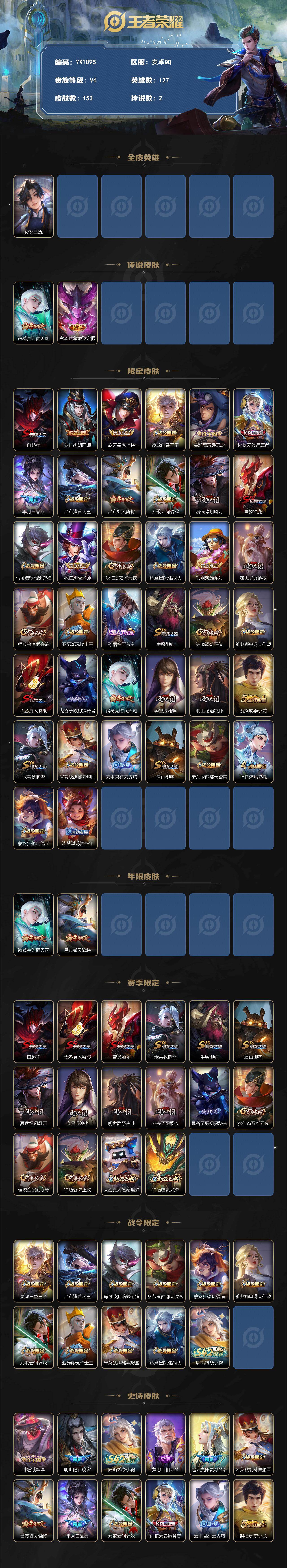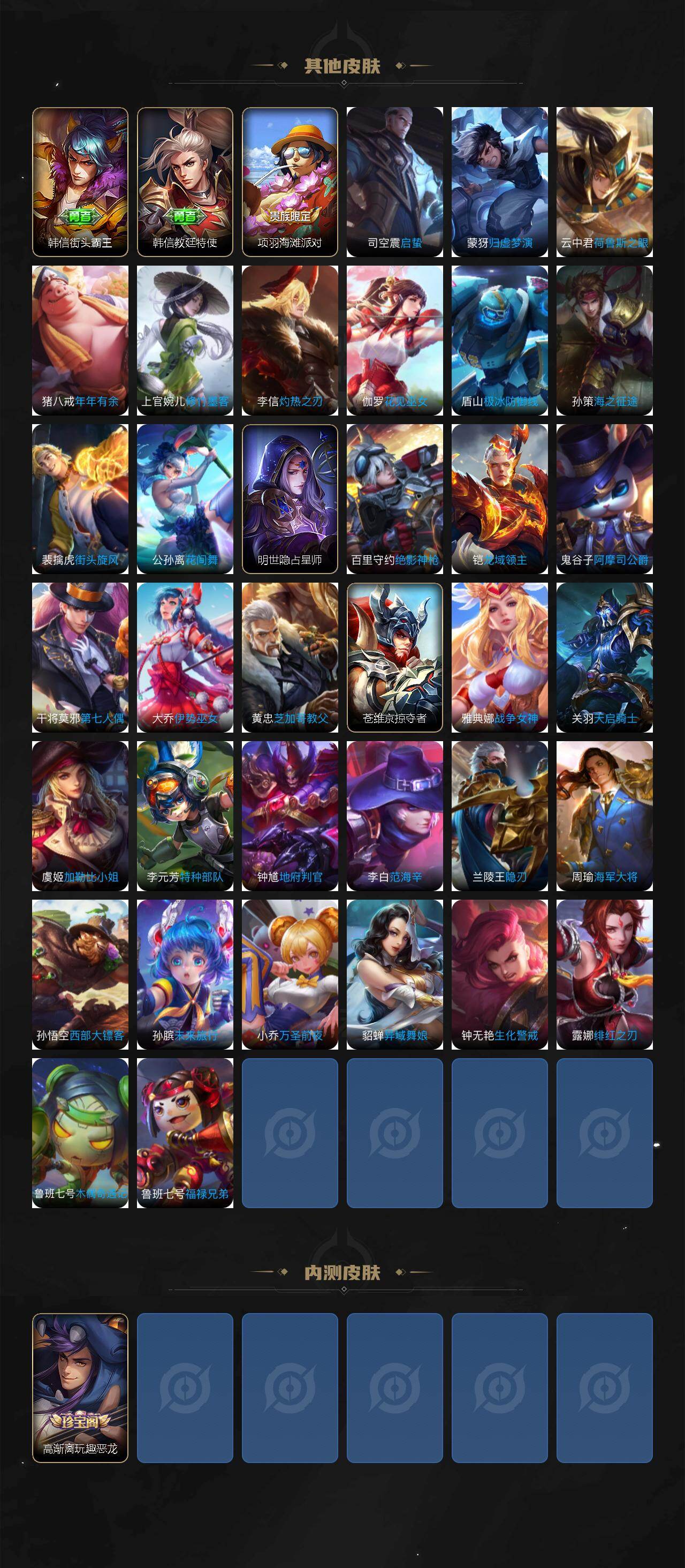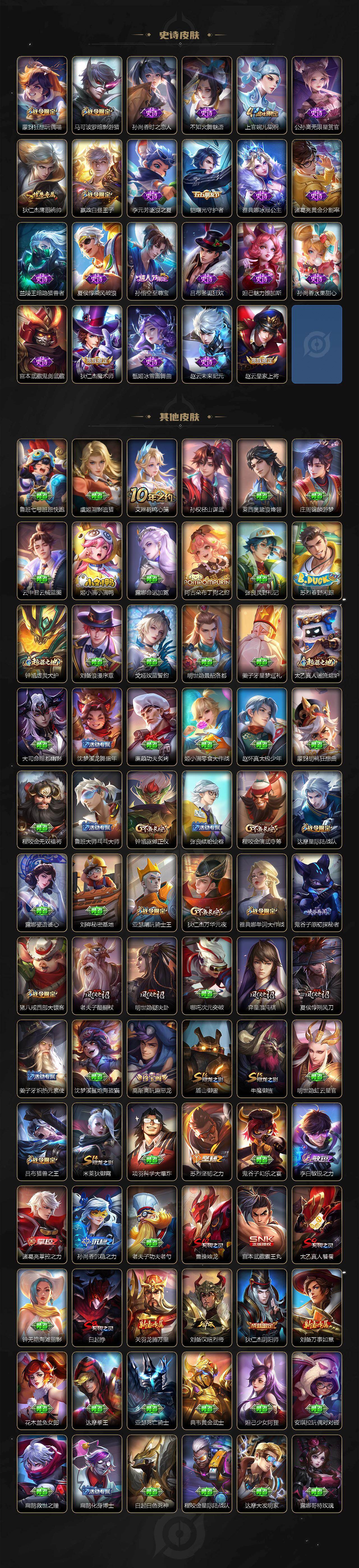 【限定皮肤】:白起狰,狄仁杰阴阳师,赵云皇家上将,嬴政白昼王子,高渐离玩趣恶龙,孙膑天狼运算者,芈月白晶晶,吕布猎兽之王,吕布御风骁将,元歌云间偶戏,夏侯惇朔风刀,曹操烛龙,马可波罗暗影游猎,狄仁杰魔术师,狄仁杰万华元夜,达摩星际陆战队,项羽海滩派对,老夫子醍醐杖,程咬金演武夺筹,亚瑟潮玩骑士王,孙悟空至尊宝,牛魔御