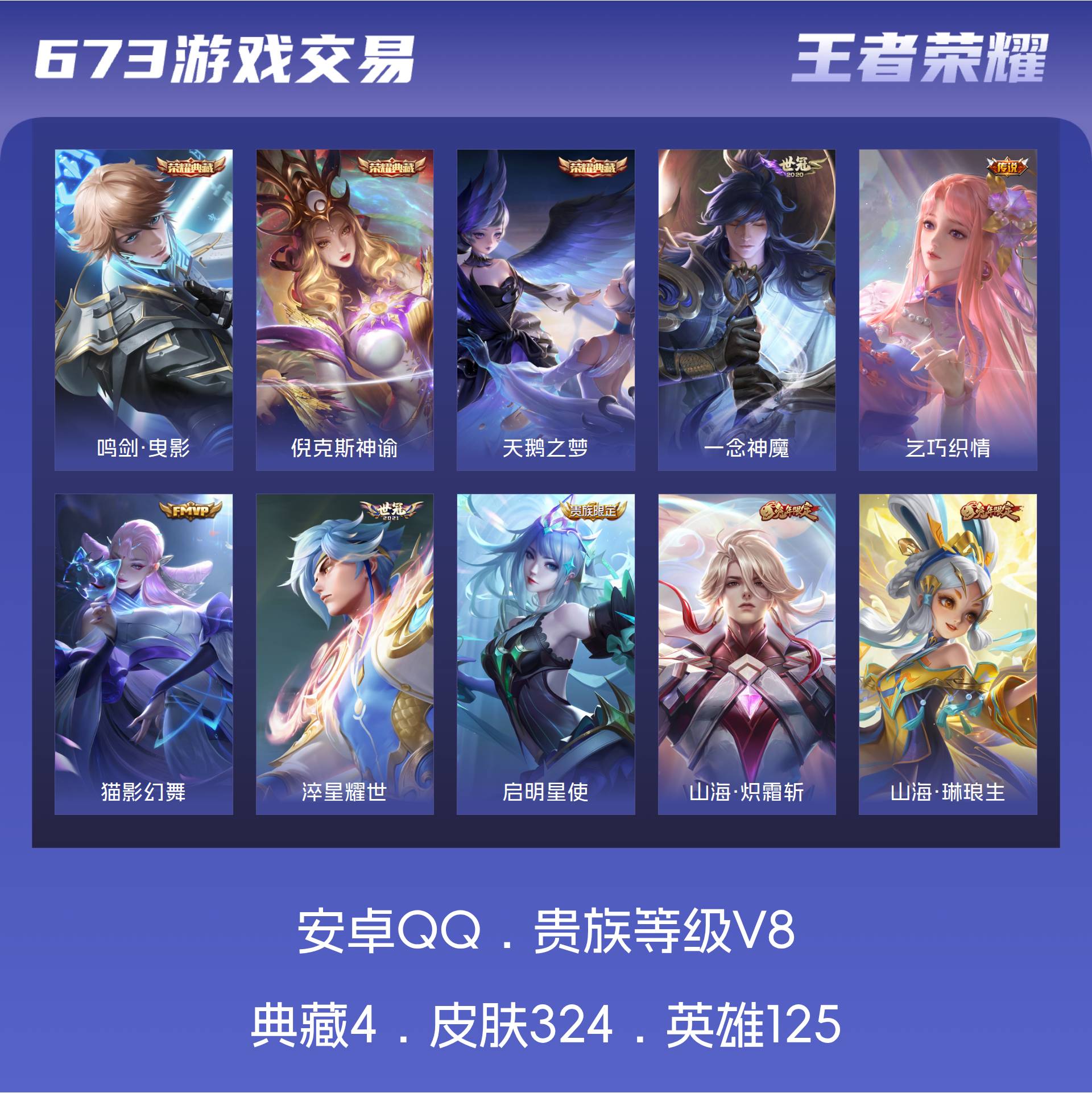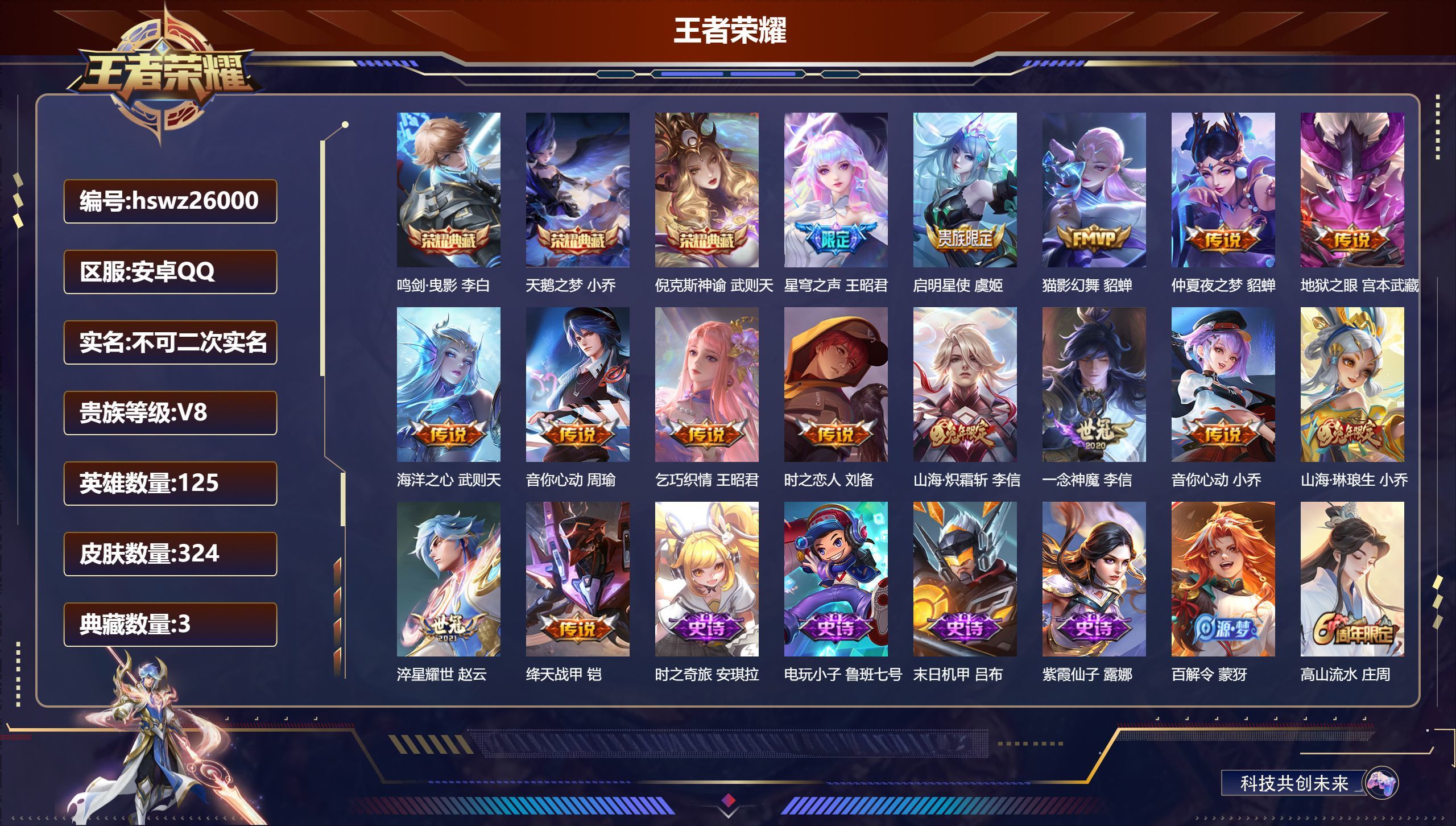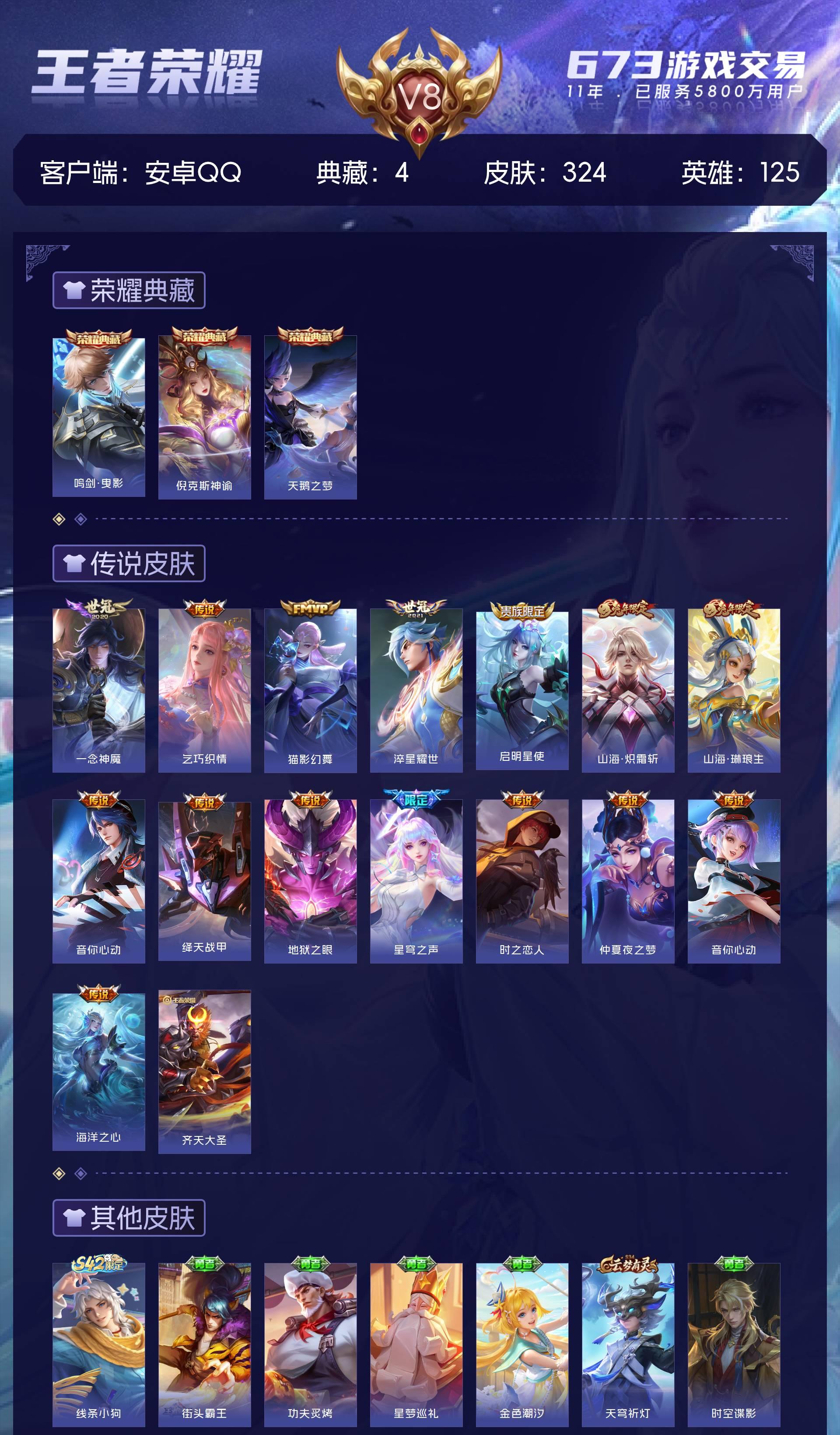 安卓QQ/至尊星耀/324皮肤/125英雄/3典藏/0珍品无双/0无双/0珍品传说/15传说/88史