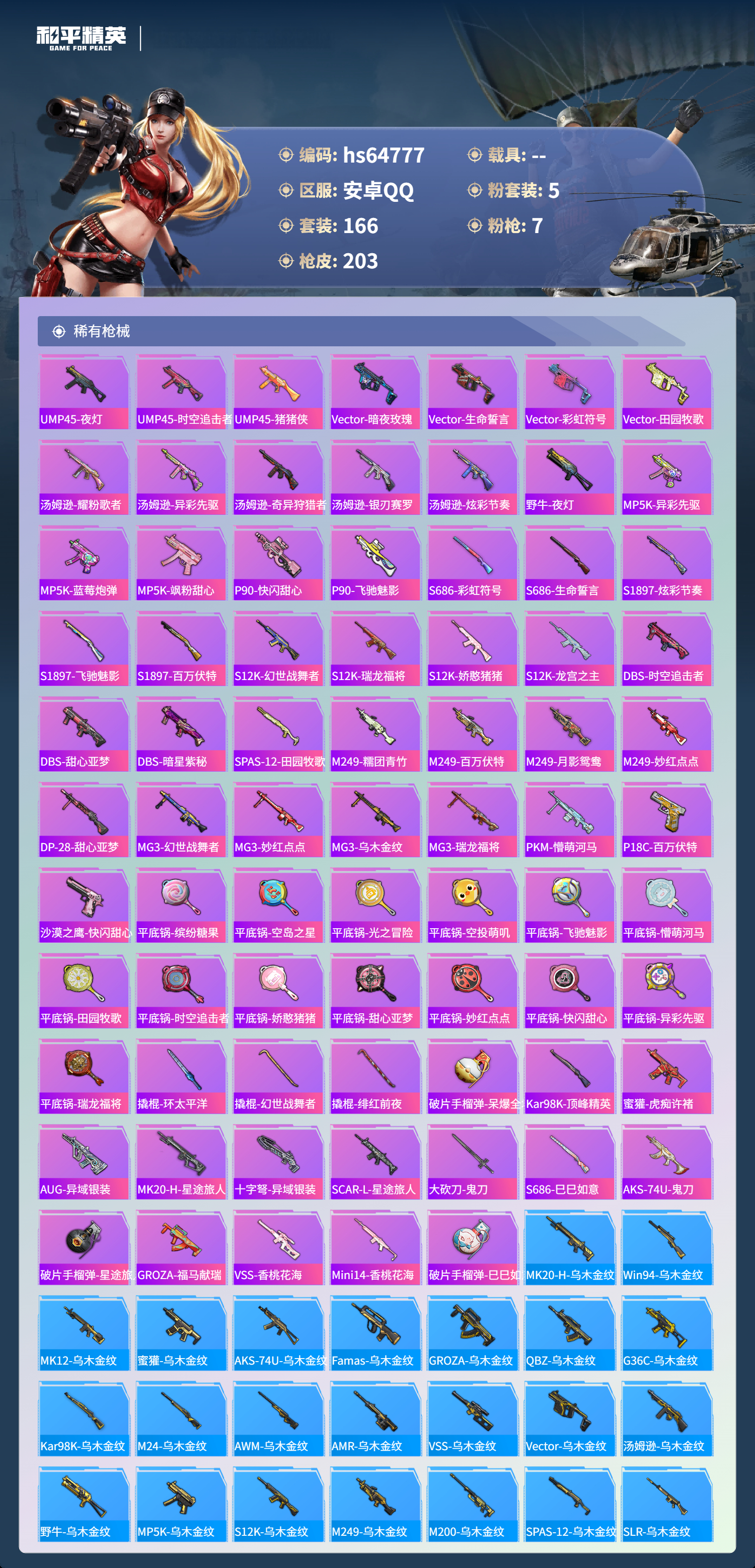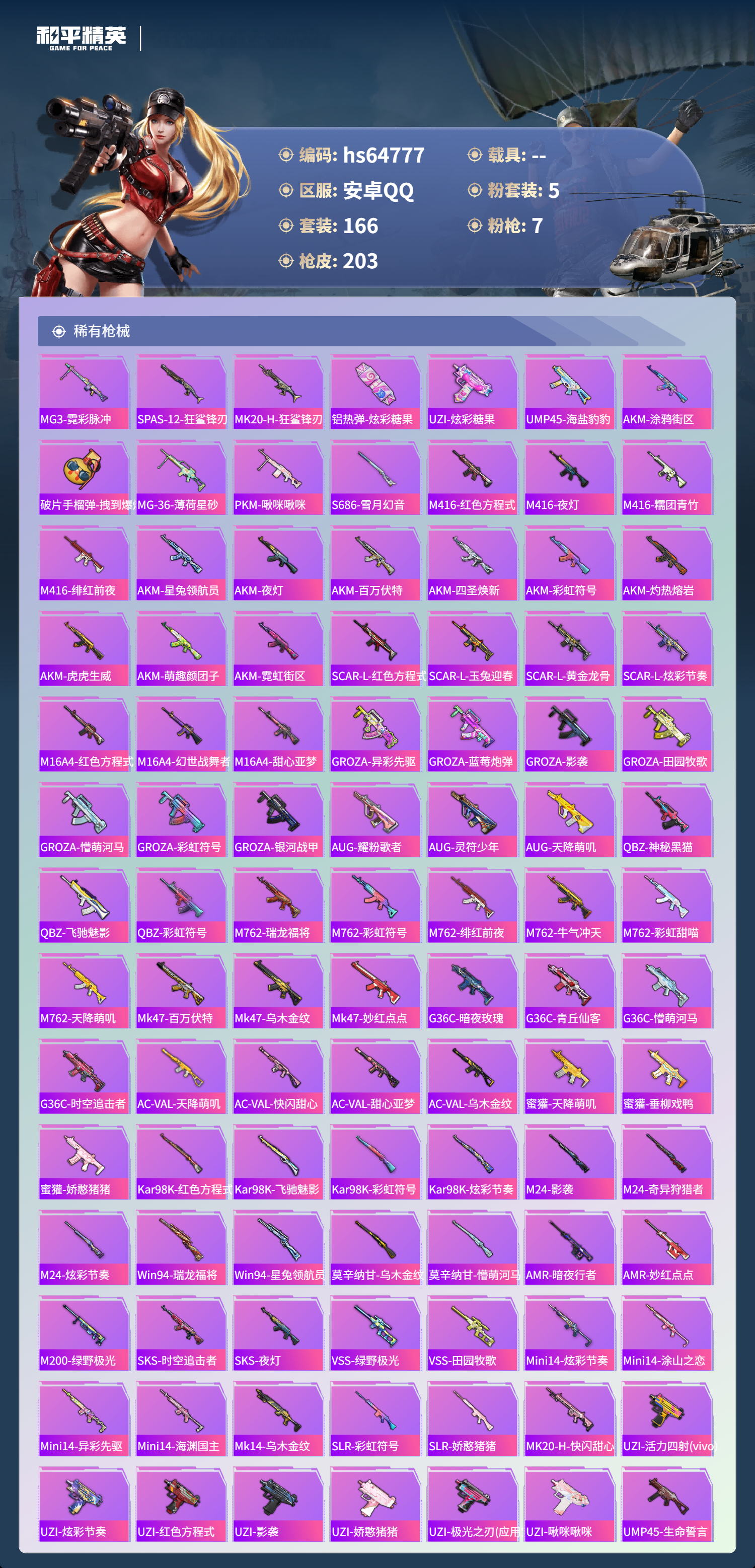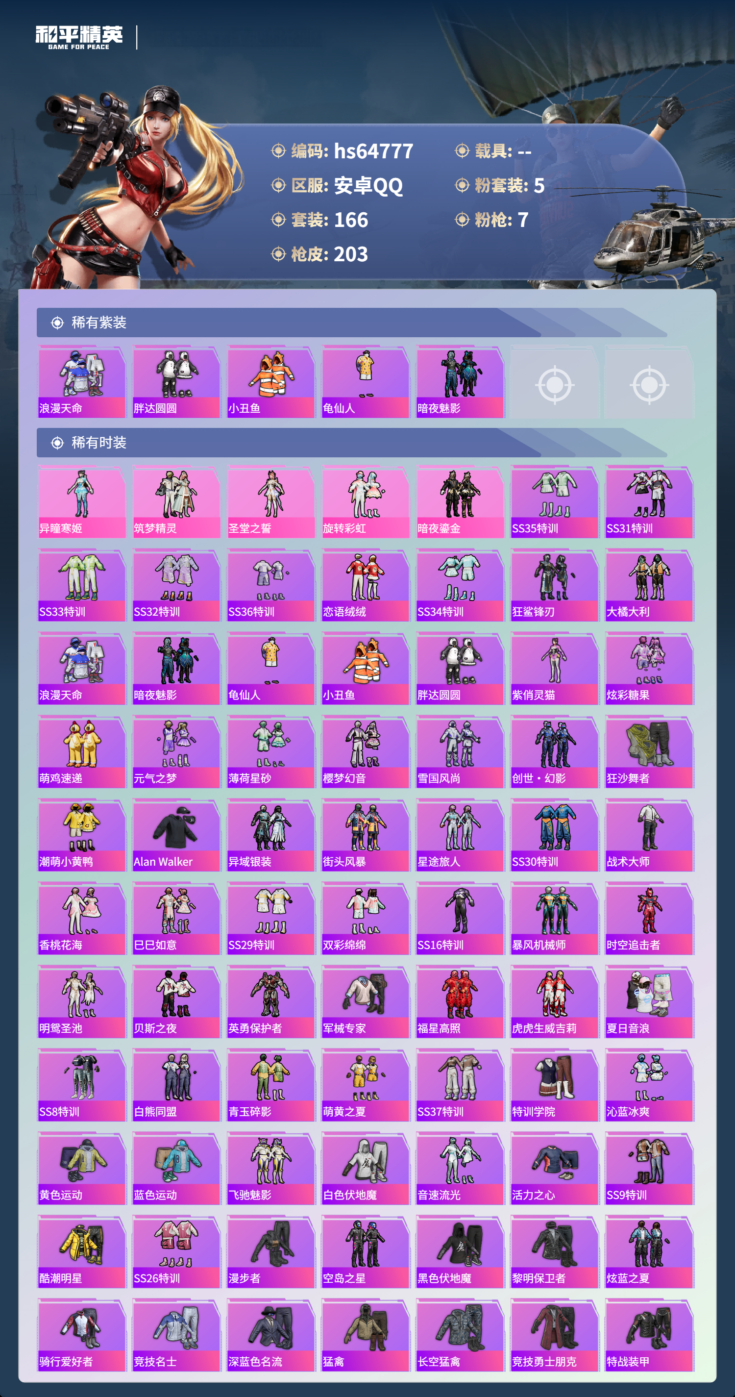 hs64777 安卓手Q-18王牌印记-有战神框-5粉装-7特效枪-72787热力值-166套装-203枪皮-1卓越印记-1传奇印记