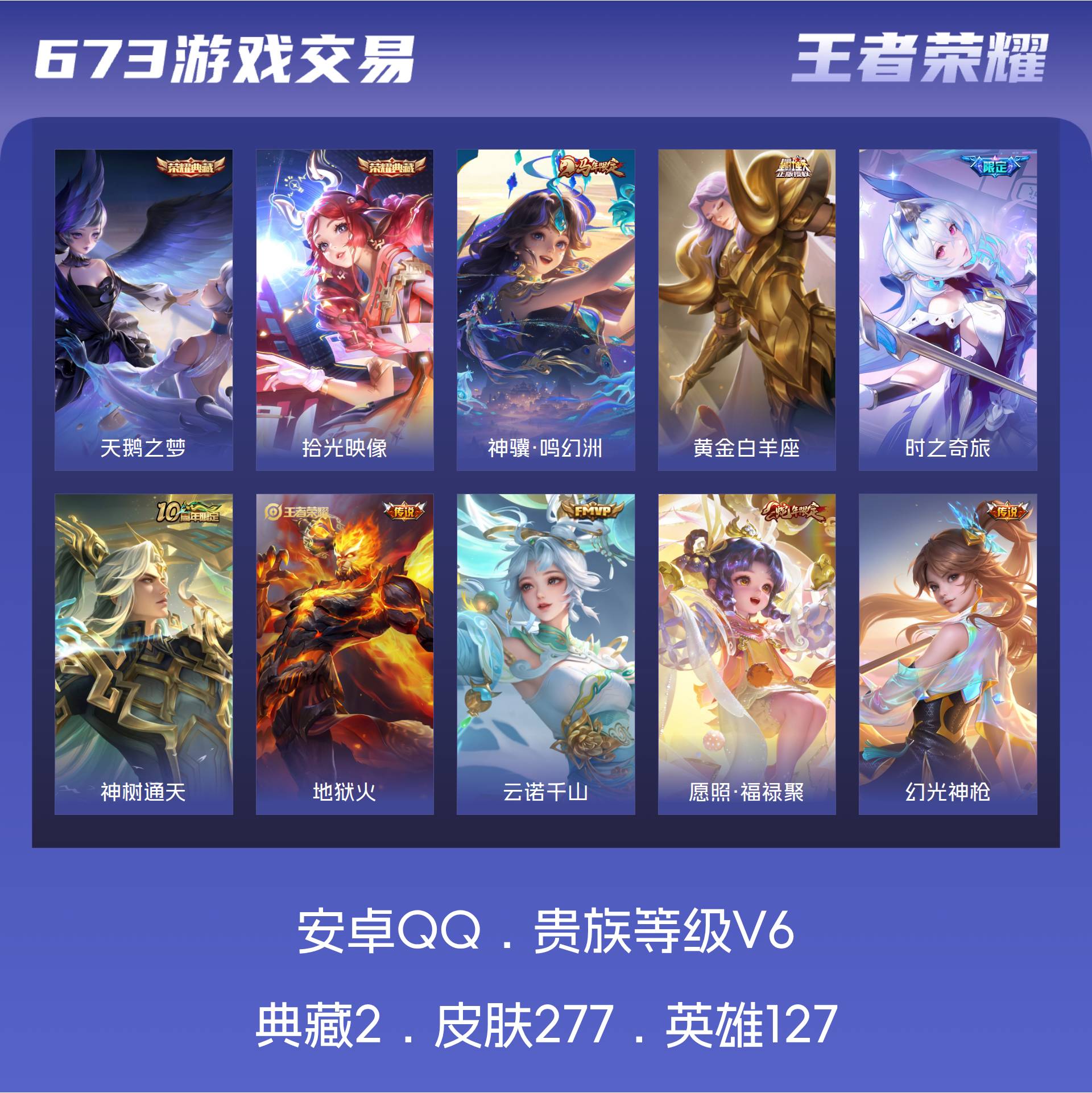 安卓QQ/最强王者/277皮肤/127英雄/2典藏/0珍品无双/0无双/0珍品传说/12传说/79史
