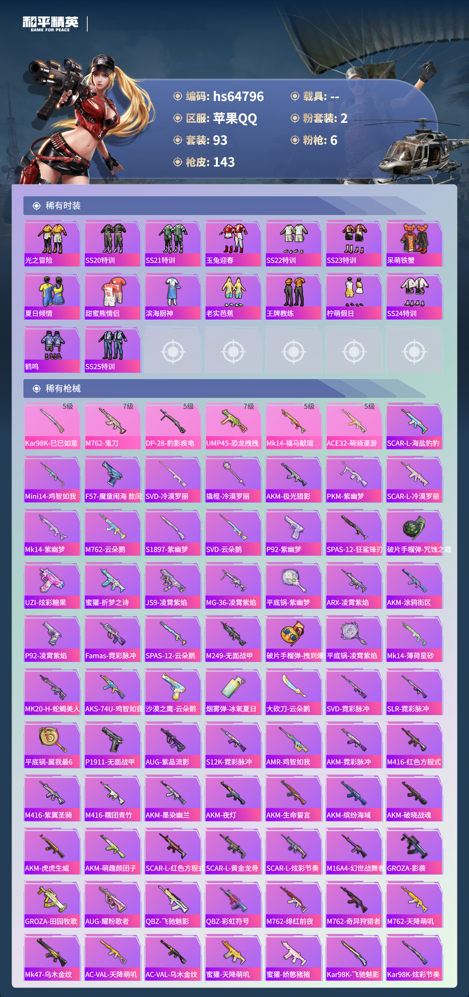 hs64796 苹果手Q-5王牌印记-2粉装-6特效枪-39412热力值-93套装-143枪皮-1卓越印记-1传奇印记