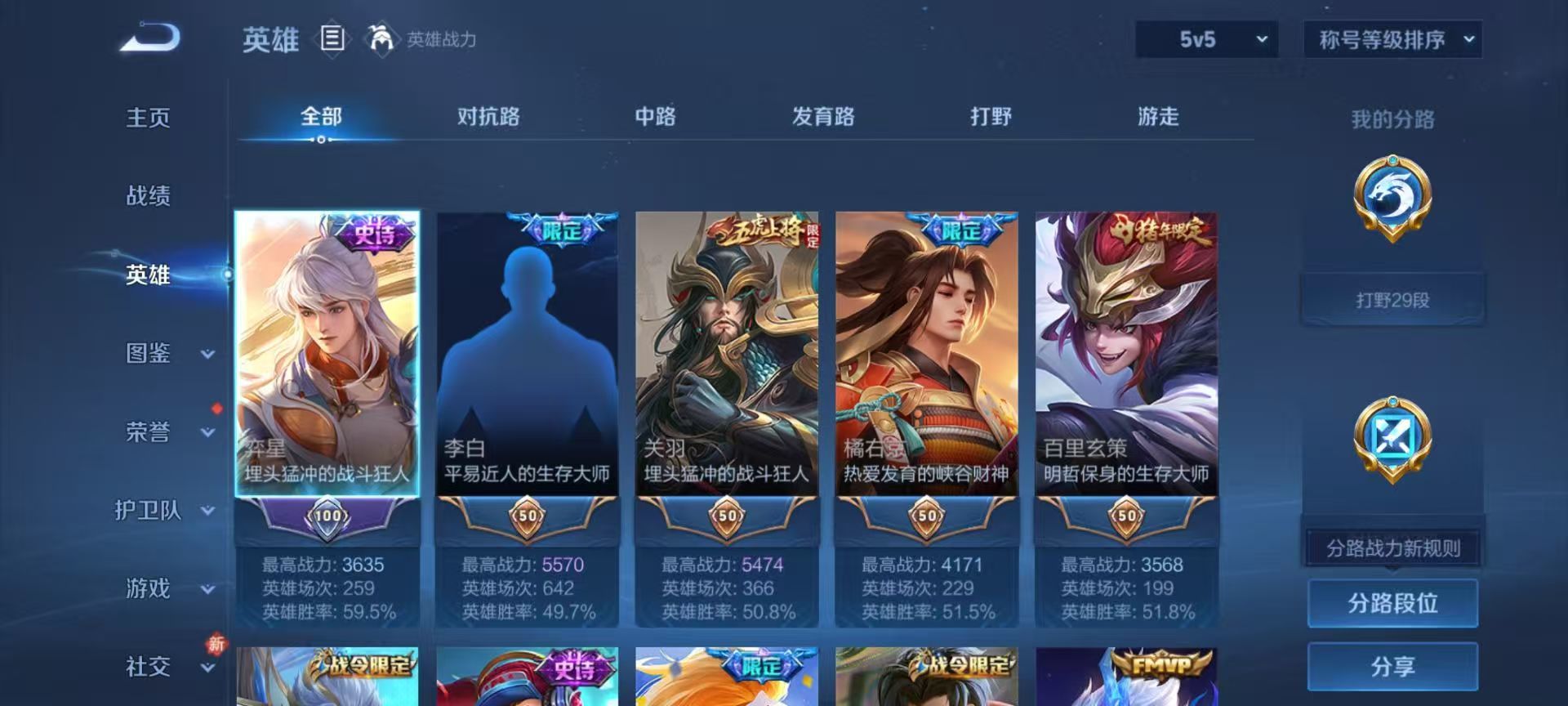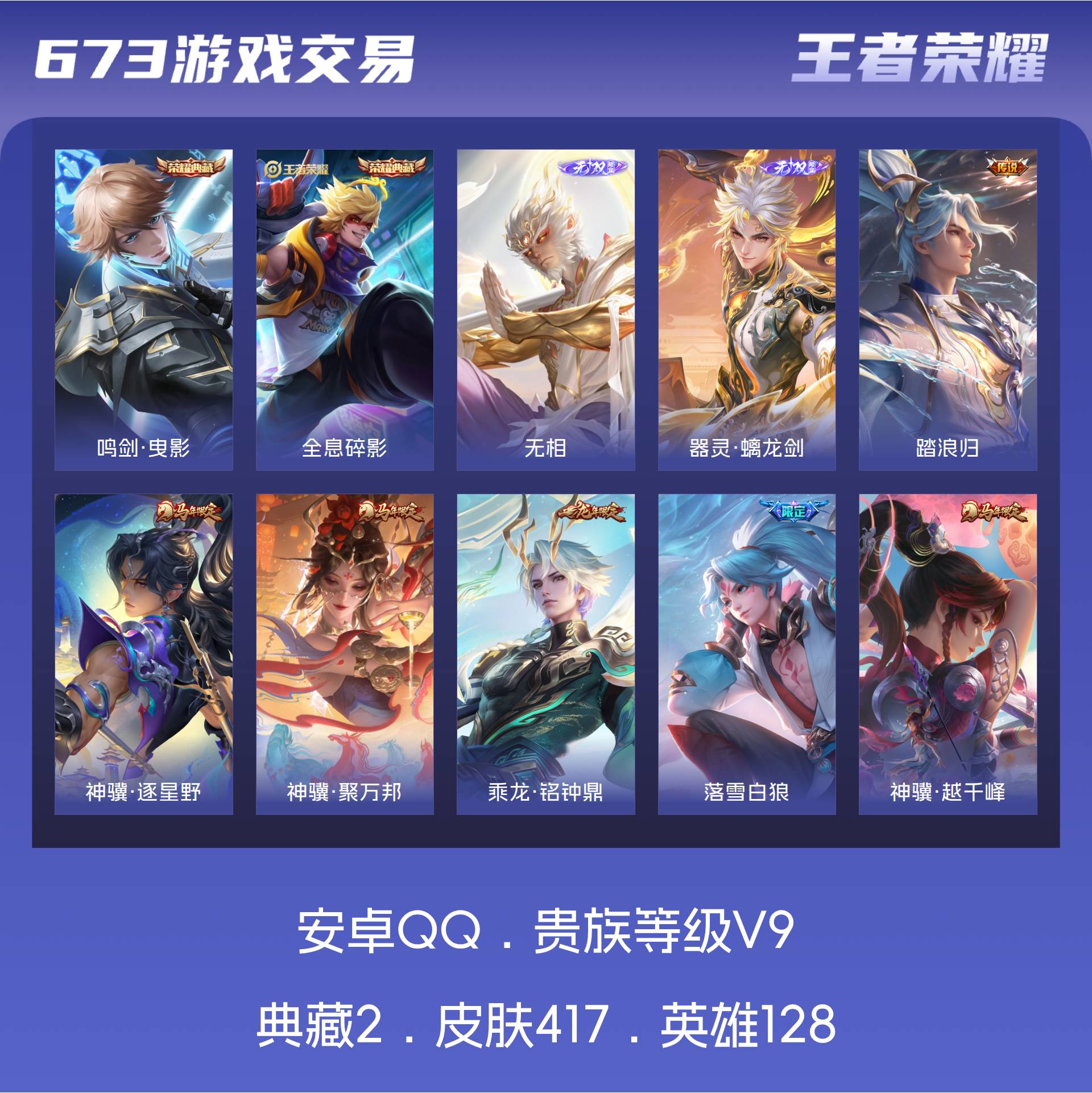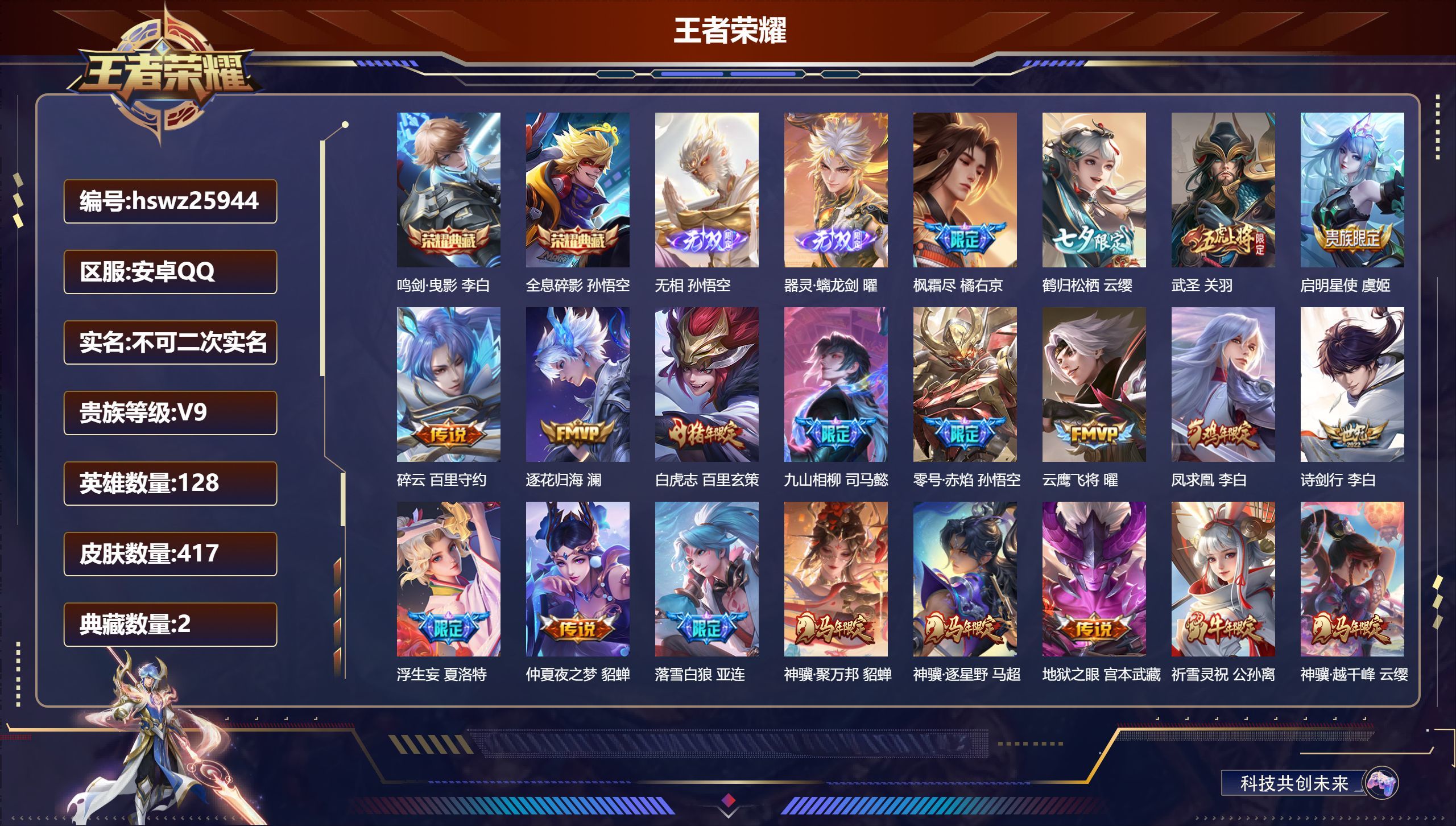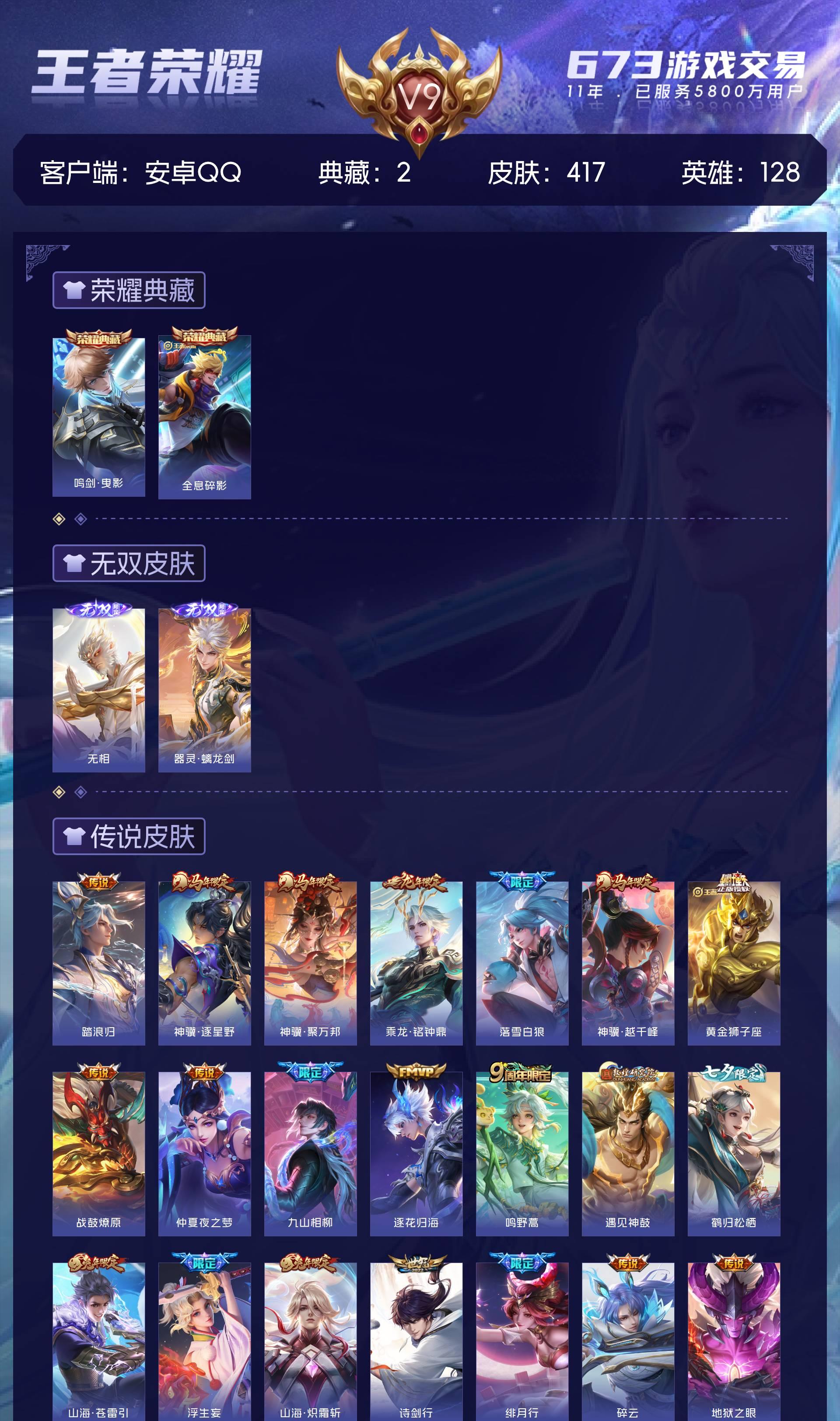 安卓QQ/荣耀王者/417皮肤/128英雄/2典藏/0珍品无双/2无双/0珍品传说/38传说/137
