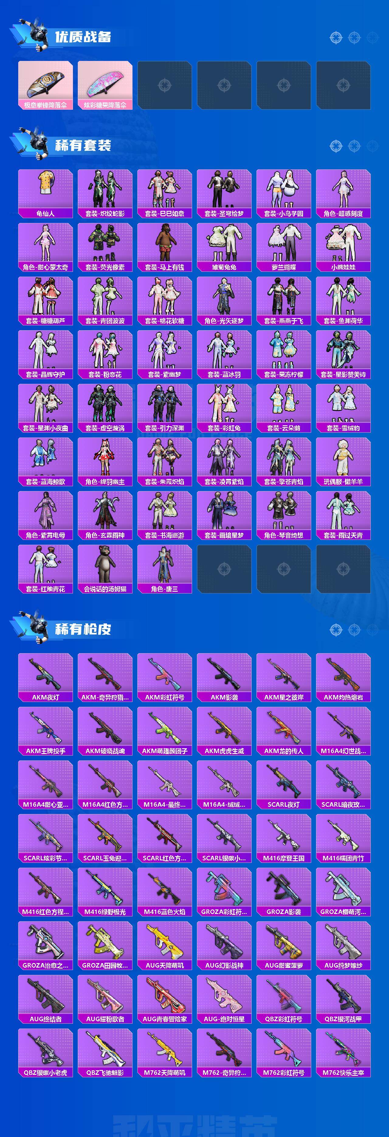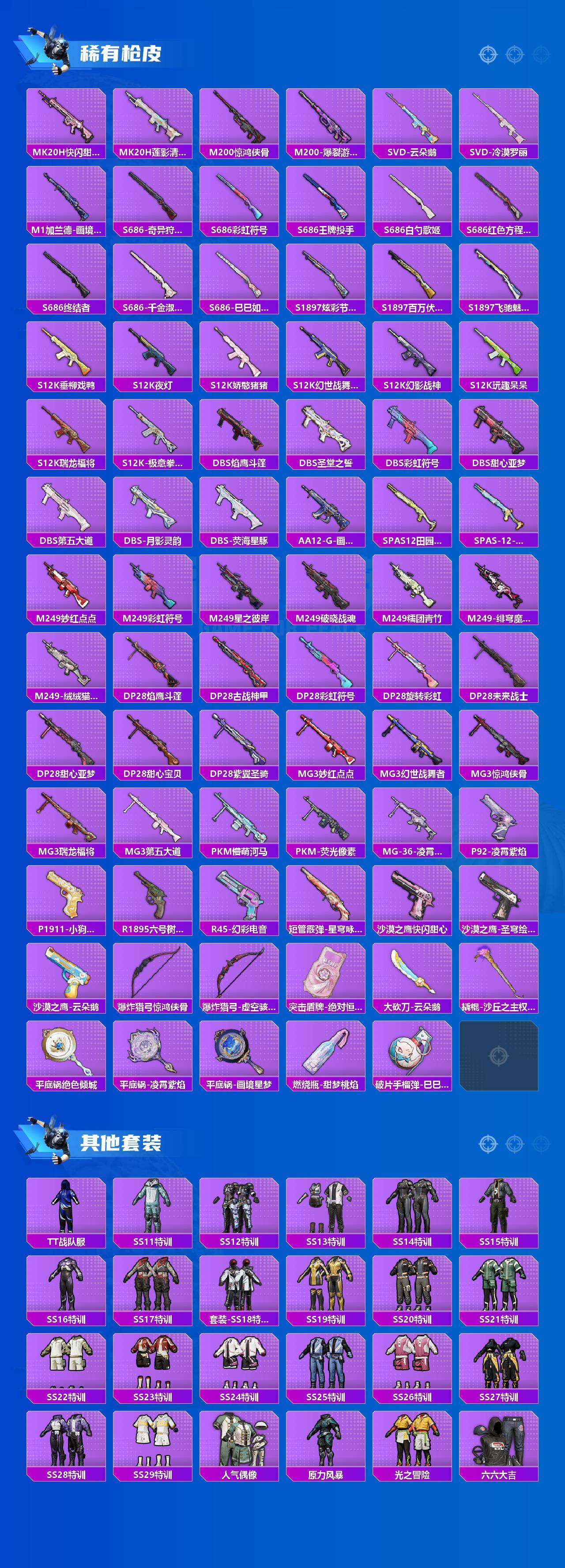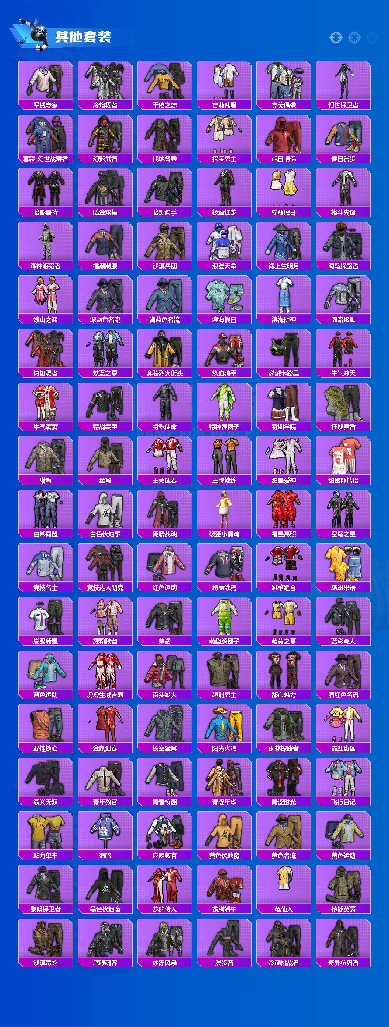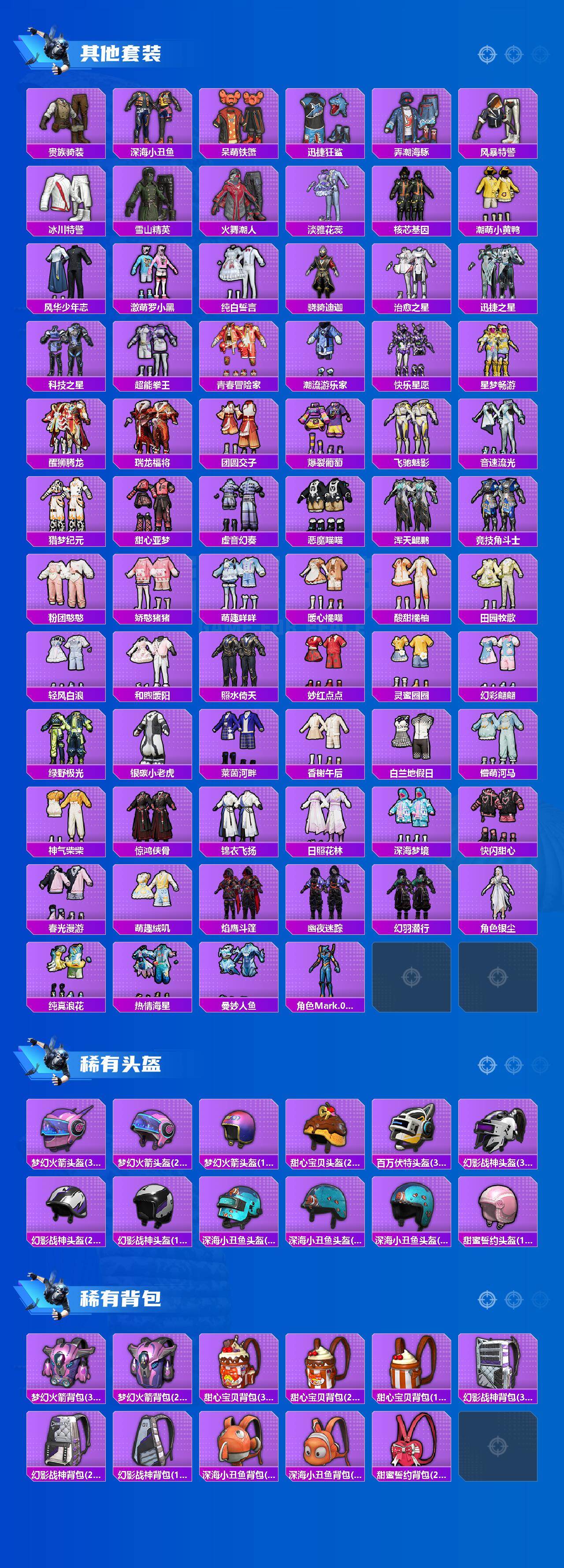 【热门品类】:粉装-梦幻火箭,套装-浪漫天命,套装-都市猎人,套装-派对舞王,套装-深海小丑鱼,套装-小丑鱼,套装-奇异狩猎者,套装-胖达团团,套装-天网终结者,套装-金羽特工,套装-忍者信条,套装-星河浪客,套装-龟仙人,套装-潮萌小黄鸭,套装-暗影哥特,角色-Mark.06,熔岩游骑兵连帽夹克