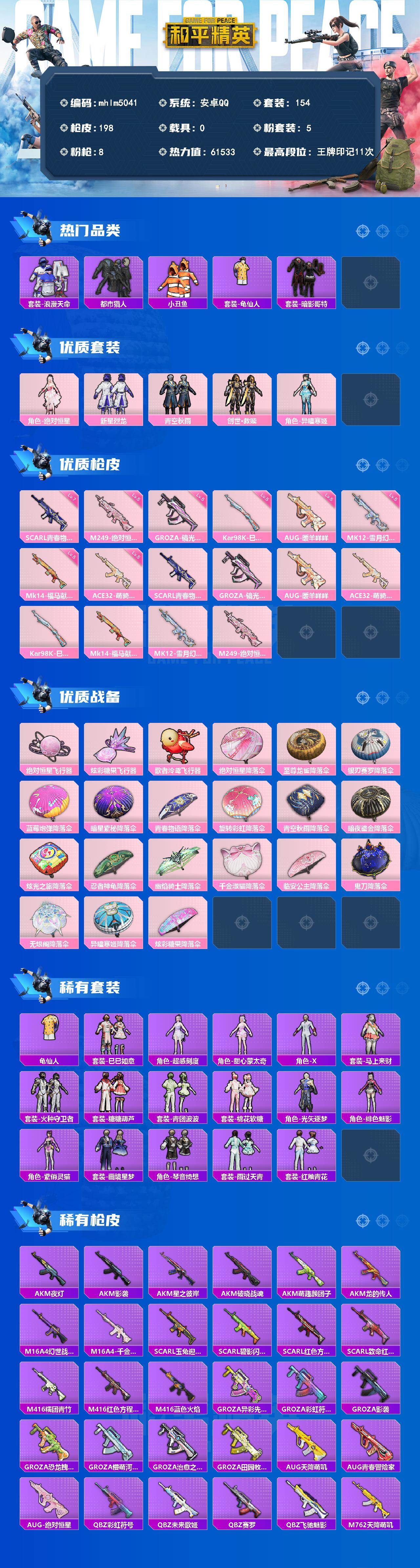 【mhlm5041】安卓 手Q-5粉装-8特效枪-0载具-3粉色飞行器-61533热力值-11王牌印记-154套装-198枪皮