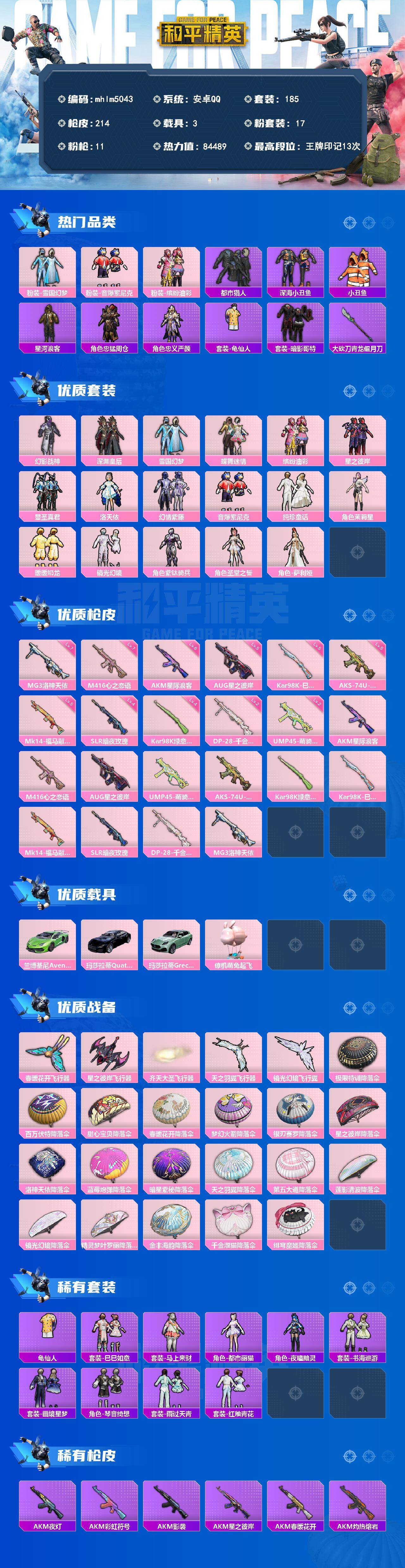 安卓 手Q-17粉装-11特效枪-3载具-5粉色飞行器-84489热力值-13王牌印记-185套装-214枪皮
