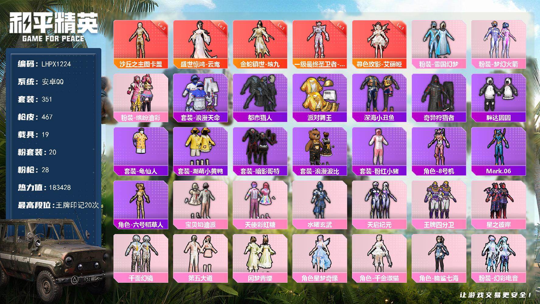 【2个3级红装小丑女都市猎人36特效枪22粉装12载具猫包 秒换绑不用等】 安卓Q区-176577热力值-308套装-509枪皮 【2红装】 沙丘之主-图卡盟(3级) 宇宙意志-塞卢姆(3级)【12载具】 护世瑞兽 照夜玉狮子 九霄玄鹿 幽焰风驰摩托车 黑曜夜骑 帕加尼imola(光影红) 炽龙极锋(暗夜黑) 辉羽雀灵自行车 冰绡玉鳞 踏焰逐风摩托车 保时捷Panamera(星辰紫)【7稀有】 都市猎人 百万伏待背包(猫包) 极限特训 冷酷挑战者 AKM-百万伏特 Mark.06蓝螳螂 8号机粉