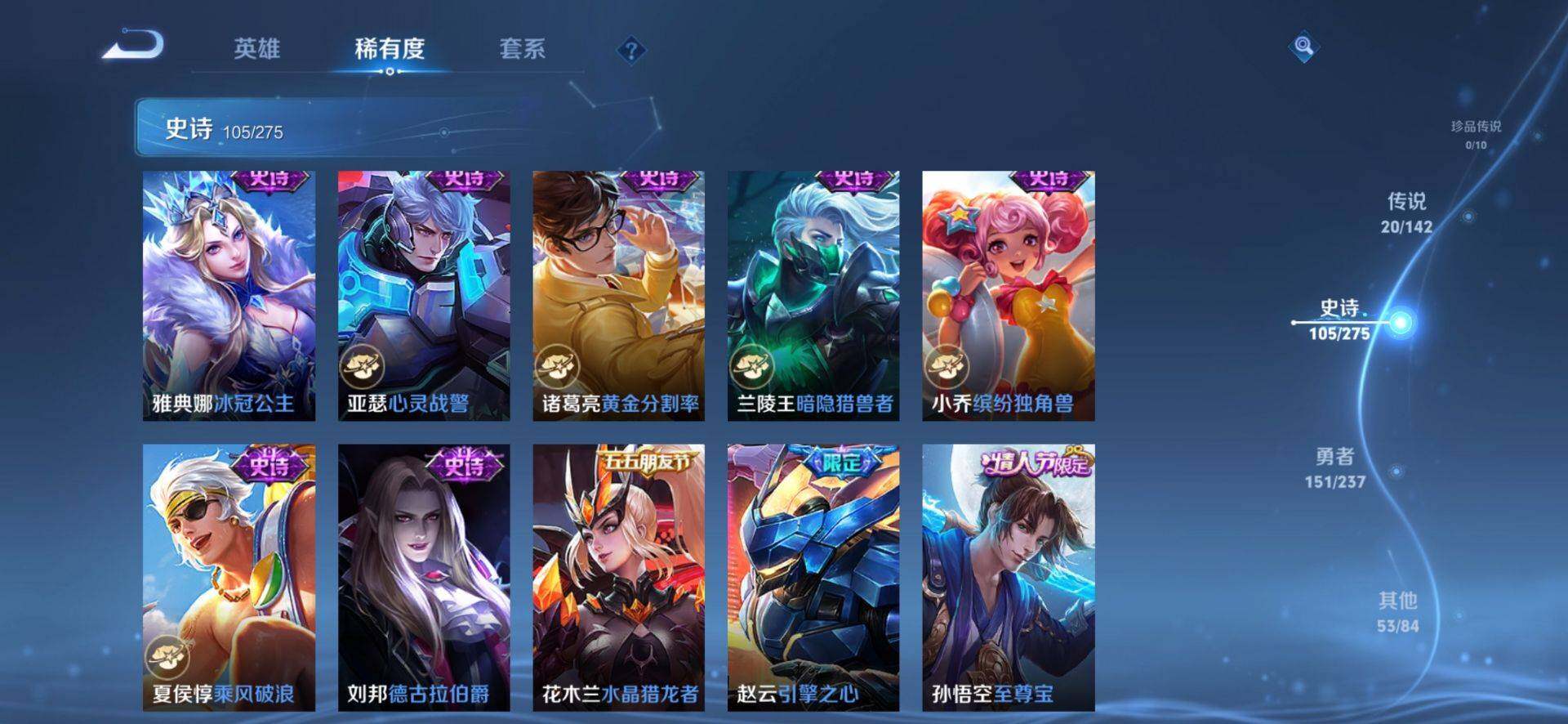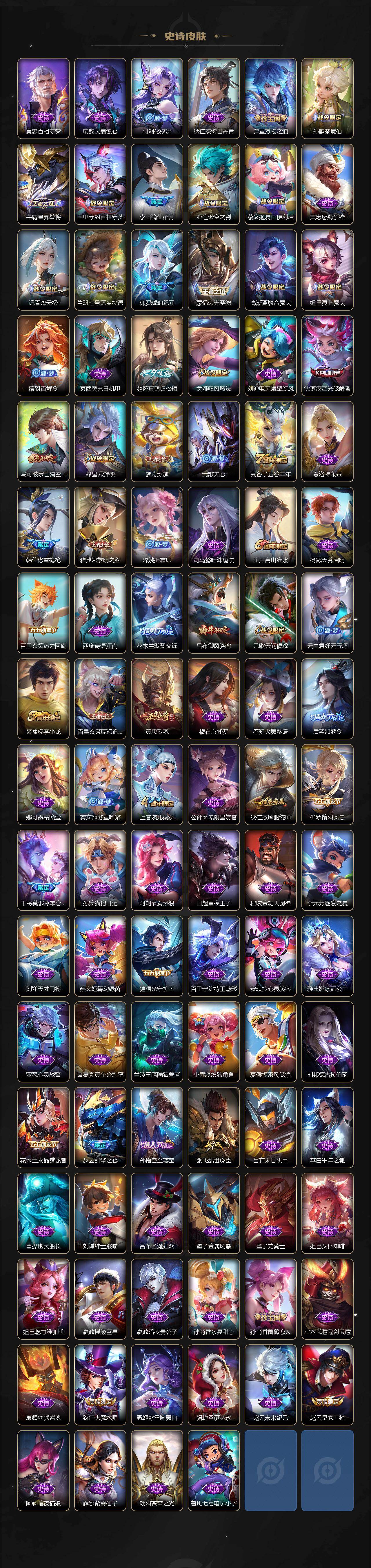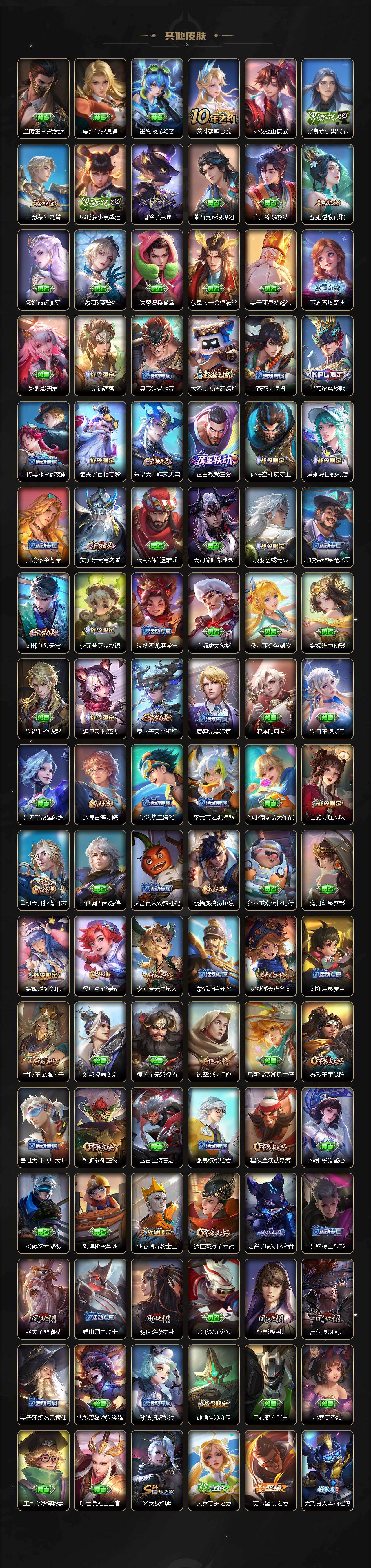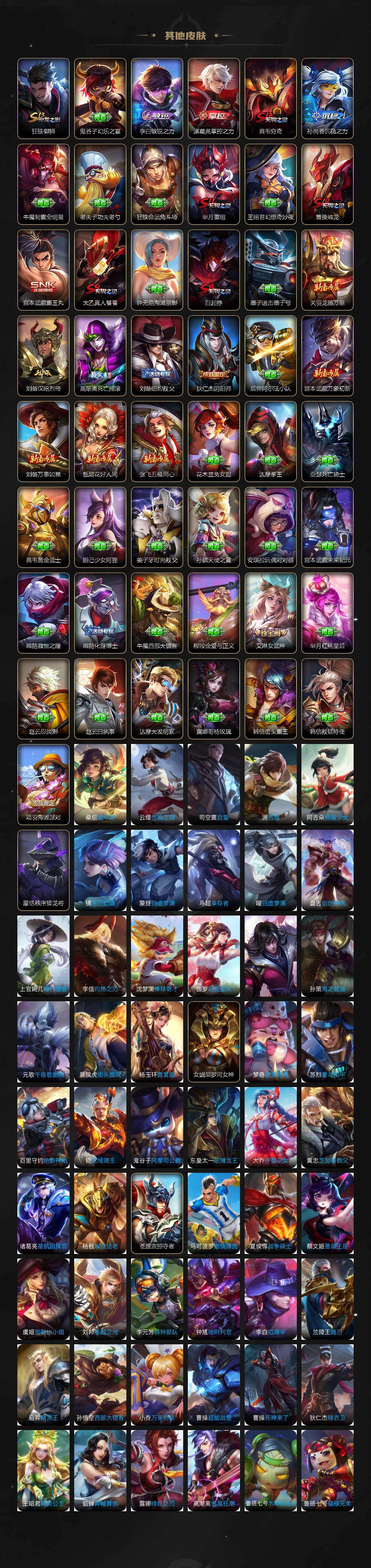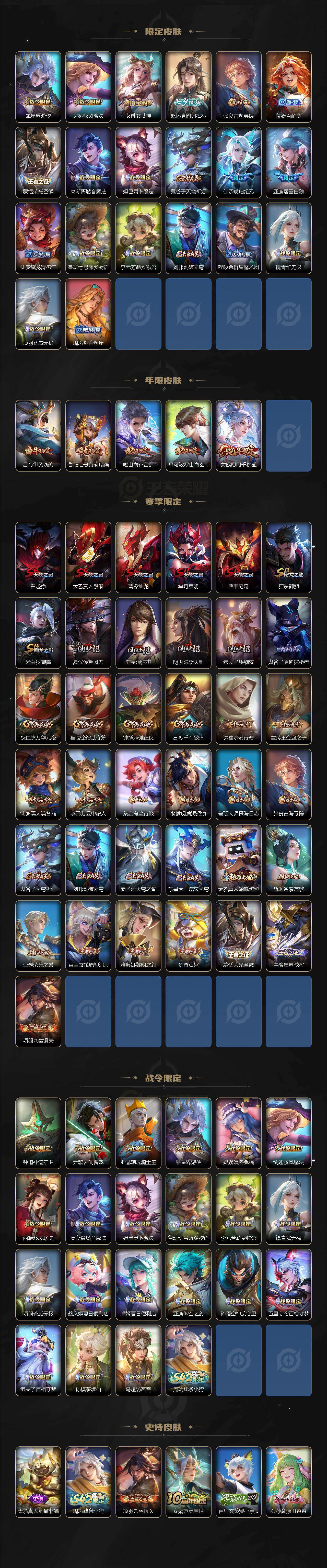 【传说皮肤】:后羿神树通天,女娲愿照千秋盛,云缨幻光神枪,裴擒虎祥瑞亨通,桑启鸣野蒿,亚连落雪白狼,澜逐花归海,马可波罗妄想实况,诸葛亮鹤羽星尊,曜山海苍