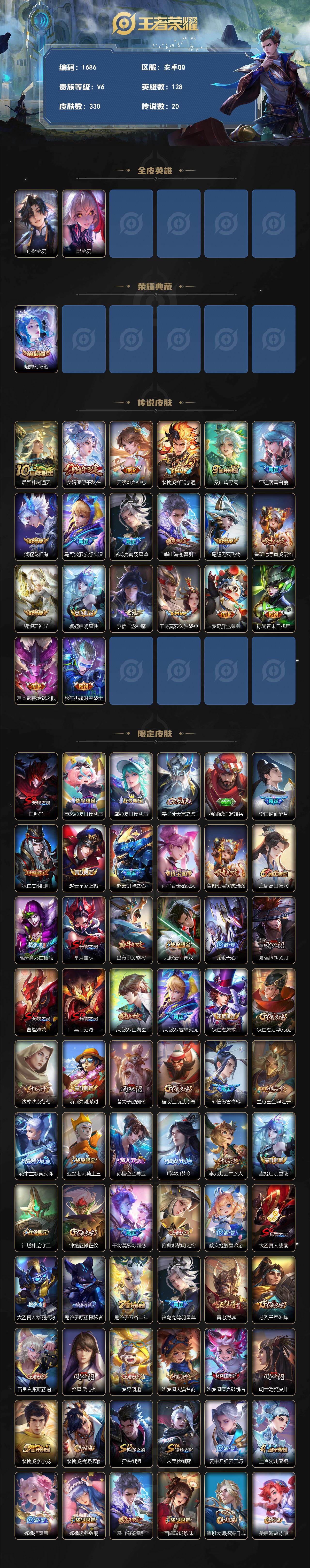 330皮肤20传说连体号 cf手游火影 CFID773230972】安卓Q-V6-最强王者段位-128英雄-330皮肤-1典藏皮肤-20传说-104史诗