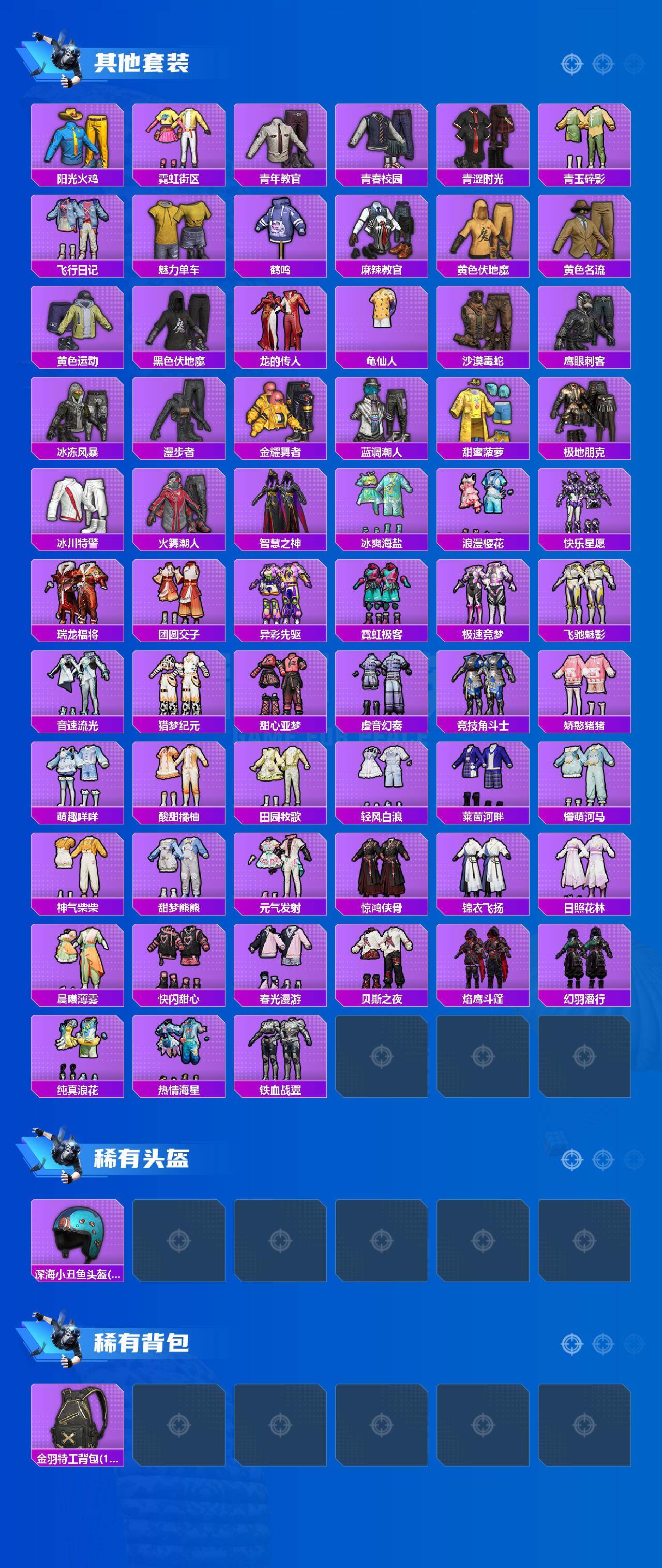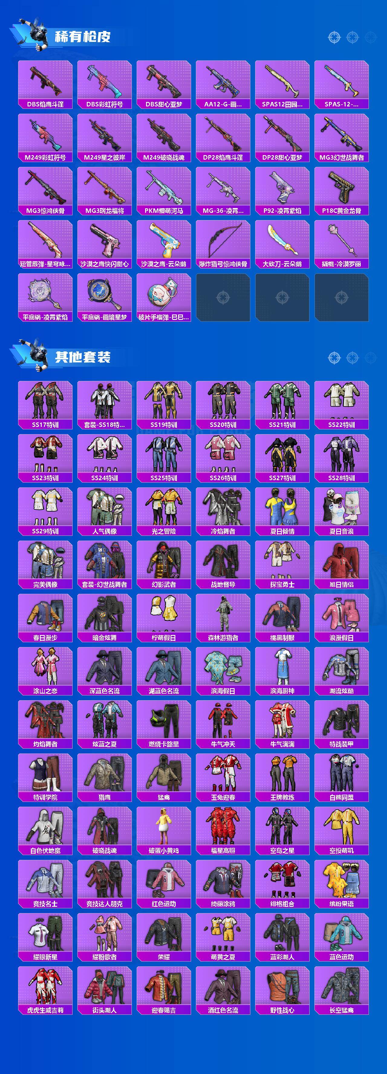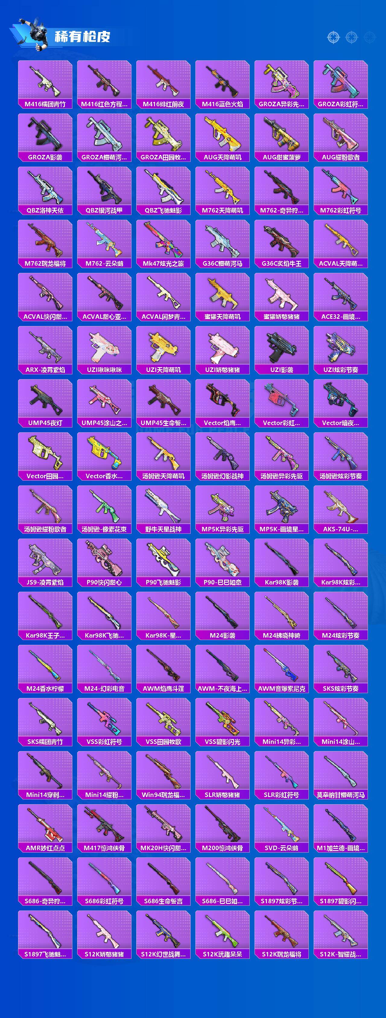 【粉色枪皮等级】:AKM-绿萝繁花(五级),SCAR-L-锦绣绵绵(五级),M416-电玩时刻(五级),GROZA-镜光银凌(五级),AUG-暖羊咩咩(五级),ACE32-萌骑漫游(四级),UMP45-恐龙拽拽(七级),AKS-74U-森灵之息(五级),Kar98K-巳巳如意(五级),Mk14-甜