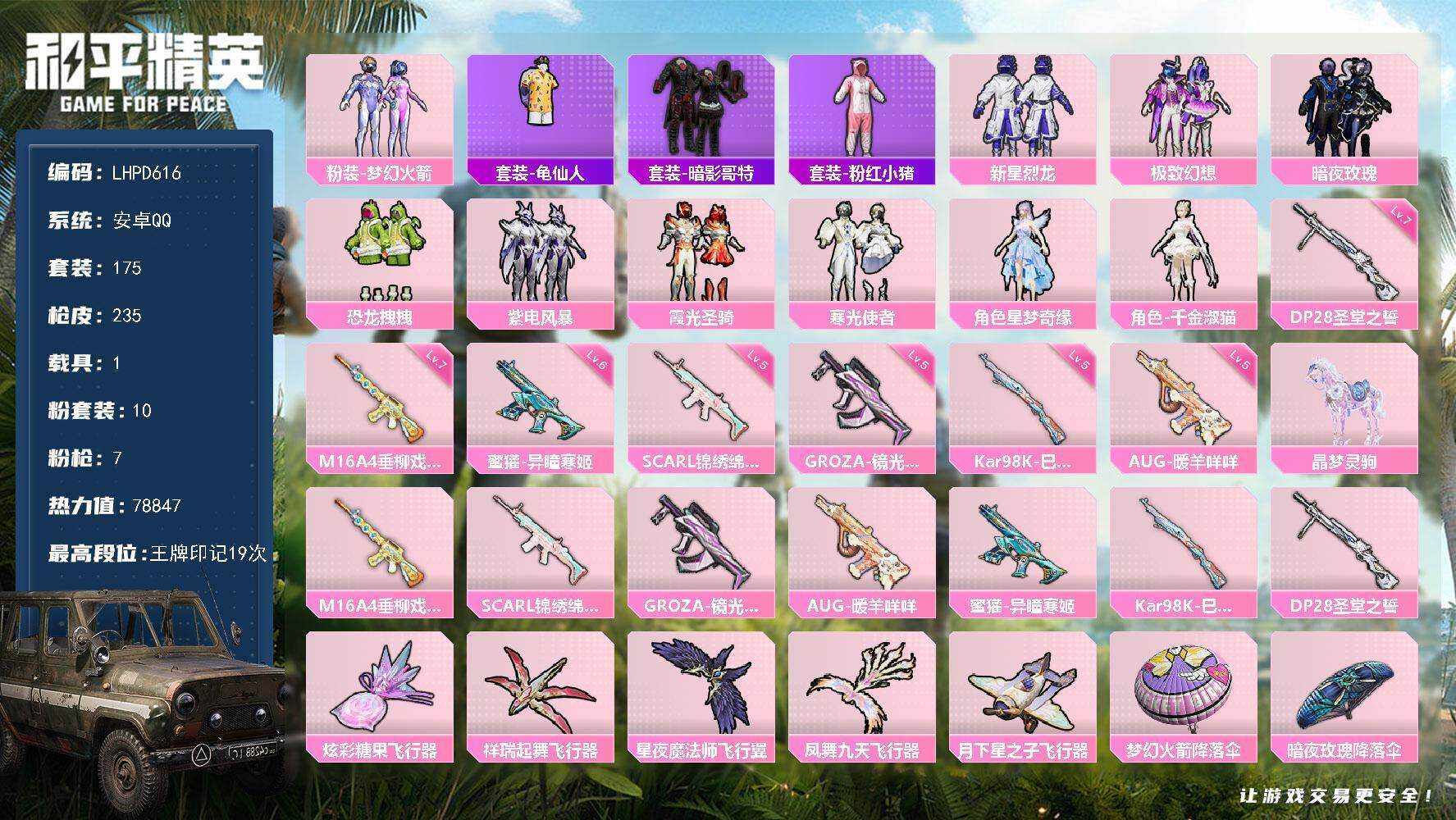【店主推荐捡漏号!可直接换绑】安卓 手Q-10粉装-7特效枪-1载具-5粉色飞行器-78847热力值-19王牌印记-175套装-235枪皮【热门品类】:粉装-梦幻火箭,套装-龟仙人,套装-暗影哥特,套装-粉红小猪【粉色套装】:粉装-梦幻火箭,粉装-新星烈龙,粉装-极致幻想,粉装-暗夜玫瑰,粉装-恐龙拽拽,粉装-紫电风暴,粉装-霞光圣骑,粉装-寒光使者,角色-星梦奇缘,角色-千金淑猫【粉色枪皮等级