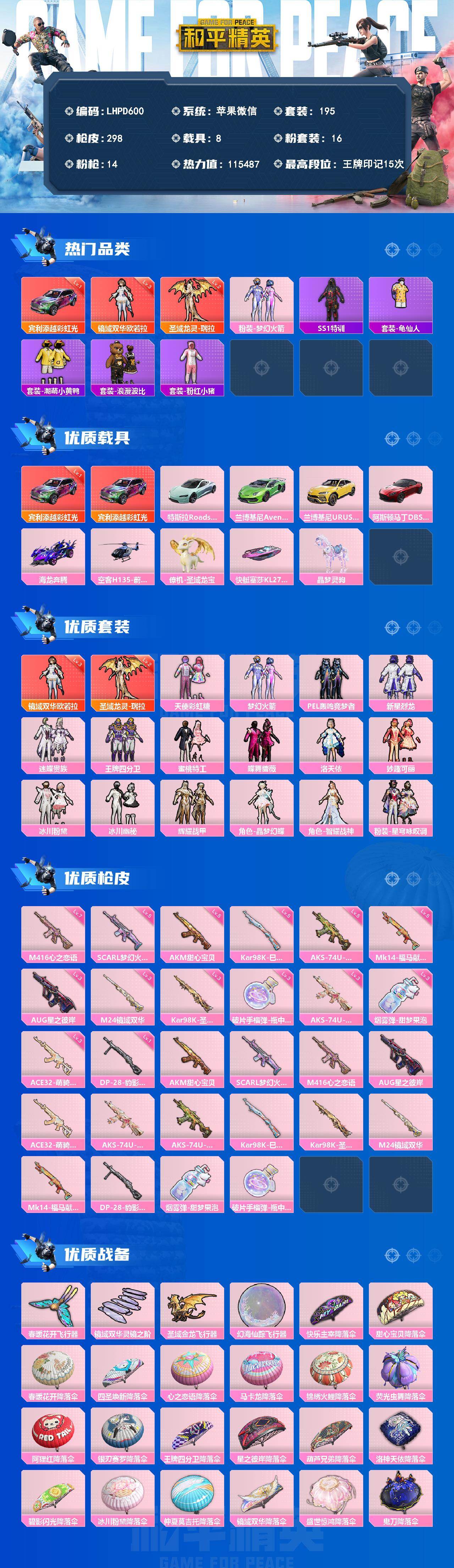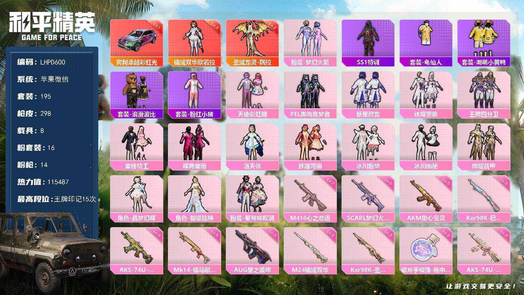 【店主推荐捡漏号!可直接换绑】苹果 微信-2神装-16粉装-14特效枪-10载具-4粉色飞行器-115487热力值-15王牌印记-195套装-298枪皮【红色载具】:宾利添越(彩虹光)(一级)【红色神装等级】:圣域龙灵-瑞拉(二级),镜域双华-欧若拉(三级)【红色角色神装】:圣域龙灵-瑞拉,镜域双华-欧若拉【热门品类】:粉装-梦幻火箭,套装-SS1特训,套装-龟仙人,套装-潮萌小黄鸭,套装-浪漫
