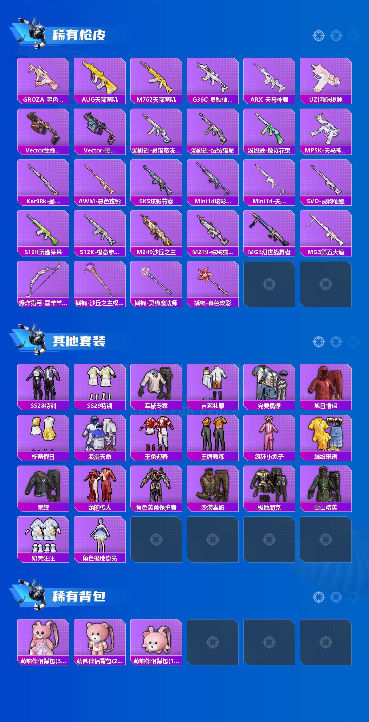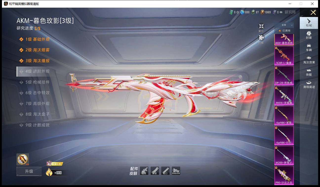 【粉色枪皮等级】:AKM-暮色玫影(三级),SCAR-L-魔童闹海 哪吒(三级),M416-灵猫魔法师(三级),UMP45-萌骑冒险(一级),AKS-