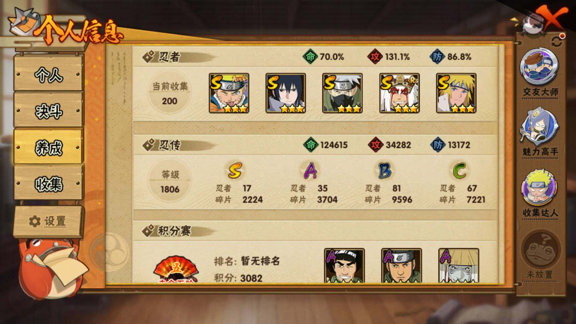 【S级忍者】:猿飞日斩「秽土转生」(3星),宇智波鼬「秽土转生」(3星),宇智波斑「秽土转生·解」(3星),艾「忍界大战」(3星),宇智波鼬「须佐能乎」(3星),宇智波止水「须佐能乎」(3星),