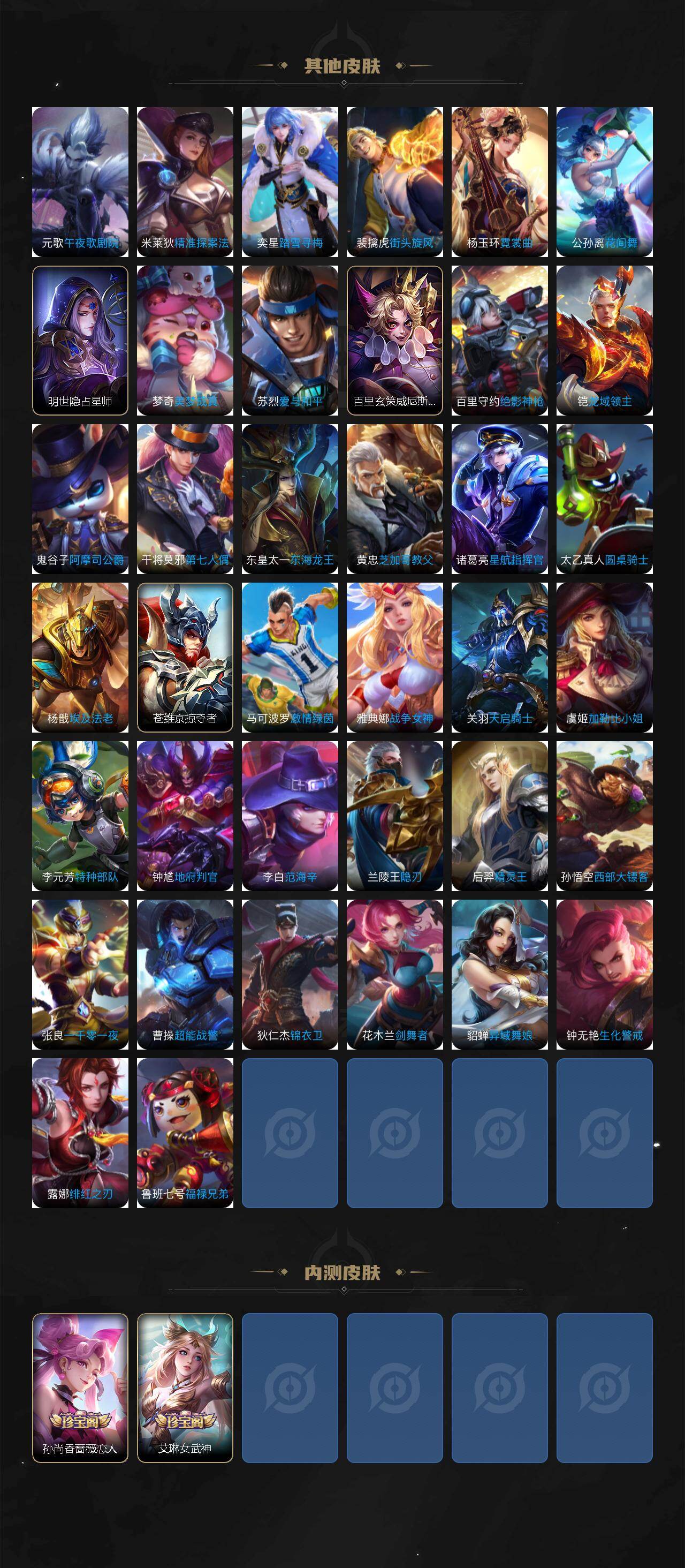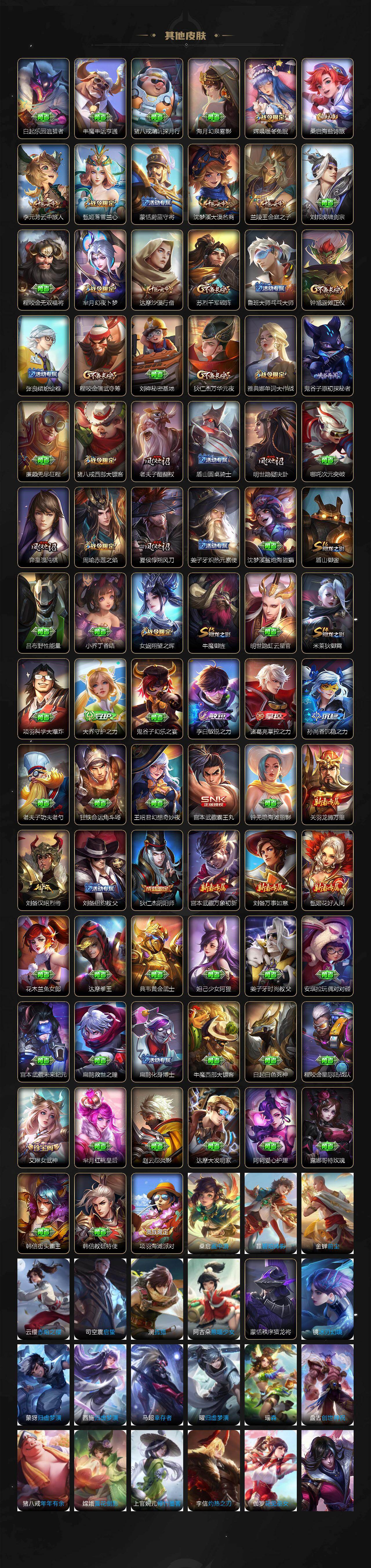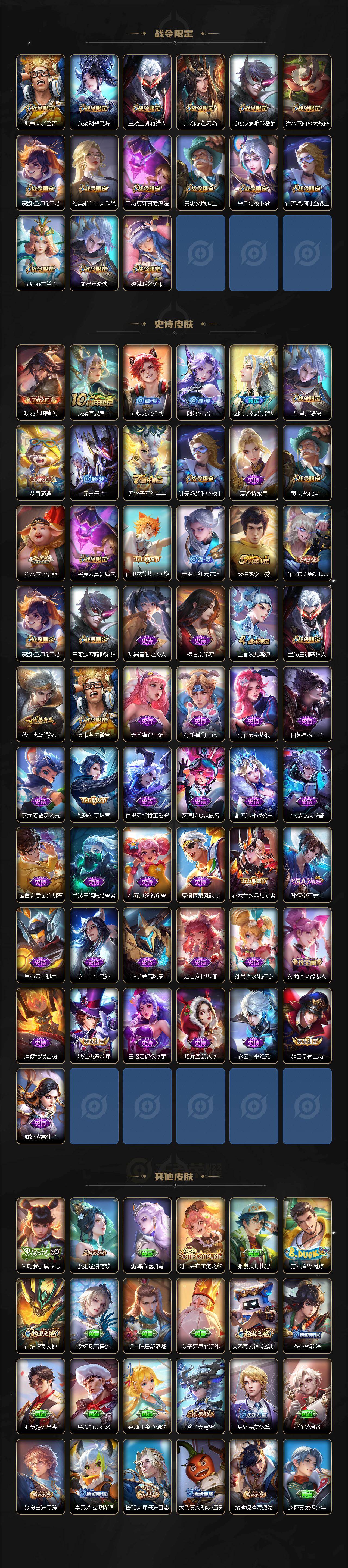 【限定皮肤】:狄仁杰阴阳师,赵云皇家上将,孙尚香蔷薇恋人,钟无艳超时空战士,芈月幻夜卜梦,周瑜赤莲之焰,元歌无心,夏侯惇朔风刀,甄姬落雪兰心,典韦蓝屏警告,马可波罗暗影游猎,