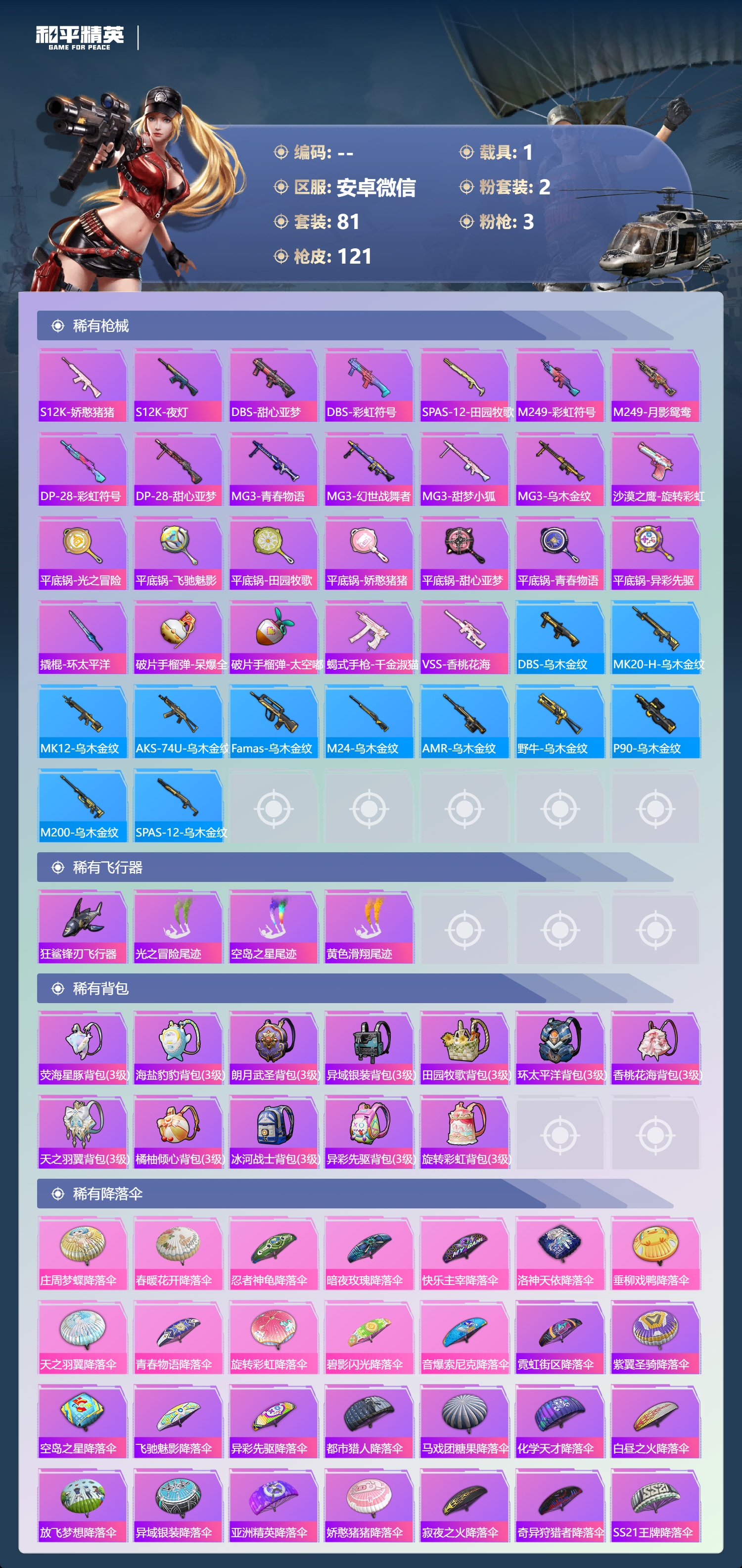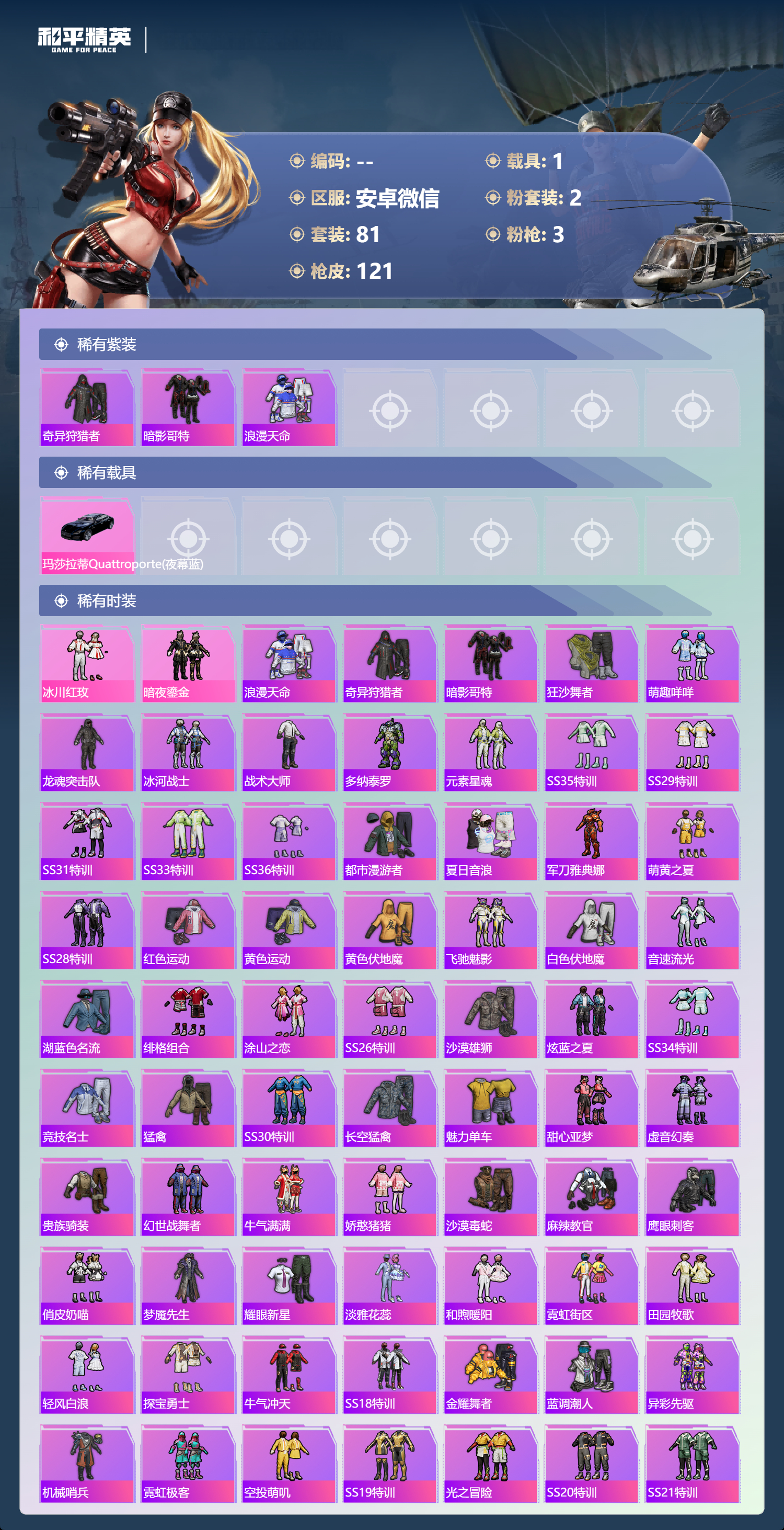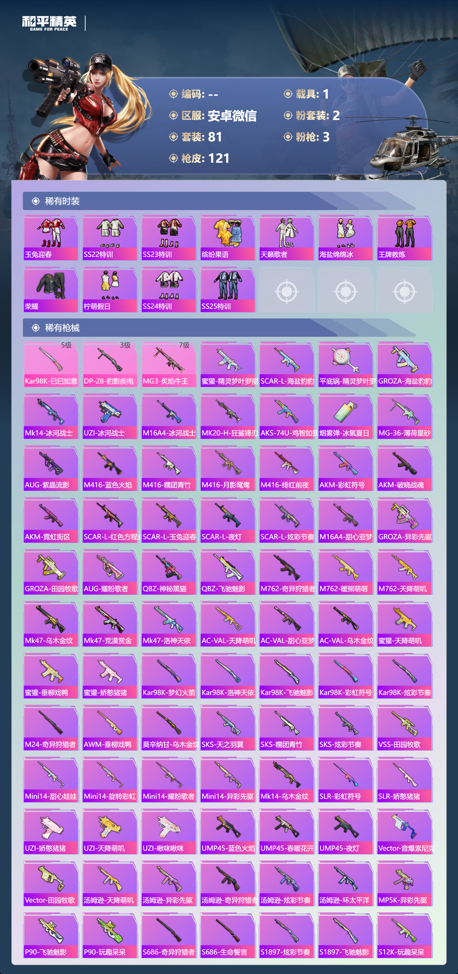 hs65354 安卓微信-1王牌印记-2粉装-3特效枪-1载具-34671热力值-81套装-121枪皮
