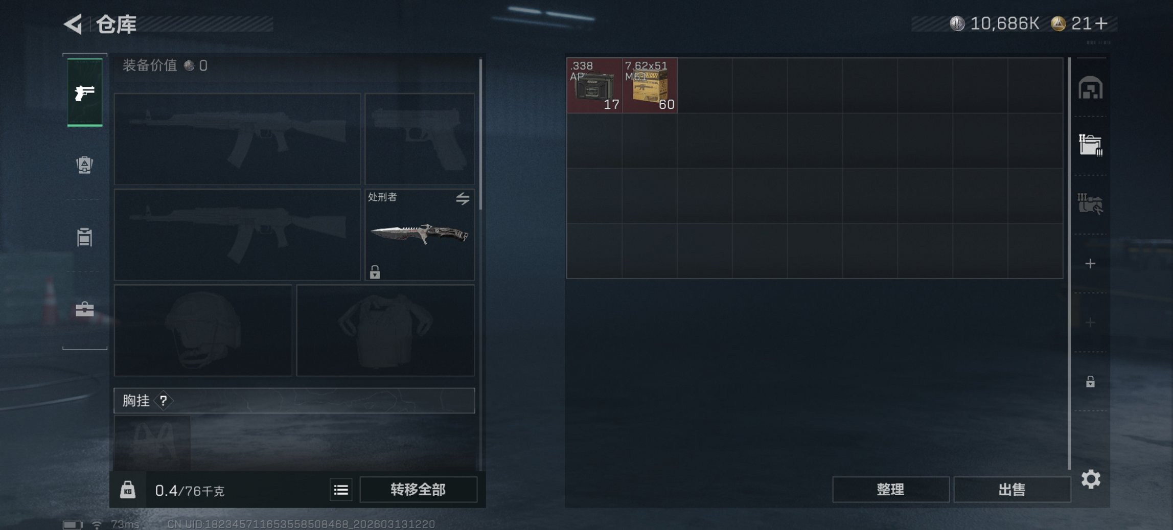 【处刑者 17颗AW子弹 总资产25M,哈夫币10,686K,行动等级:60,近战数量:1,仓库等级:5级,训练中心等级:3级,靶场等级:3级,枪皮:65 秒换绑不用等】