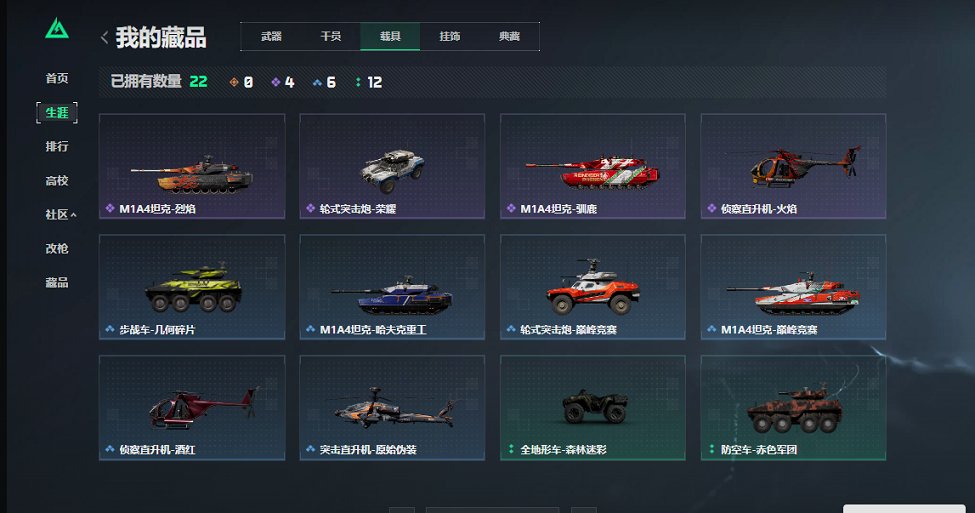 【载具】 防空车-赤色军团 步战车-几何碎片 轮式突击炮-护林人 M1A4坦克-哈夫克重工 侦察直升机-火焰 M1A4坦克-战痕 全地形车-森林迷彩