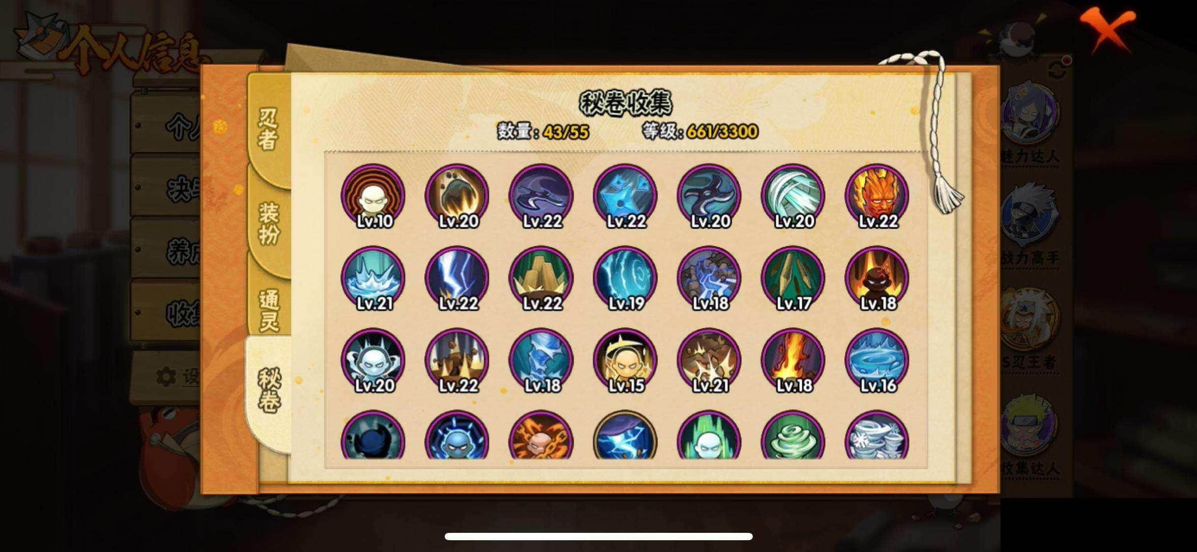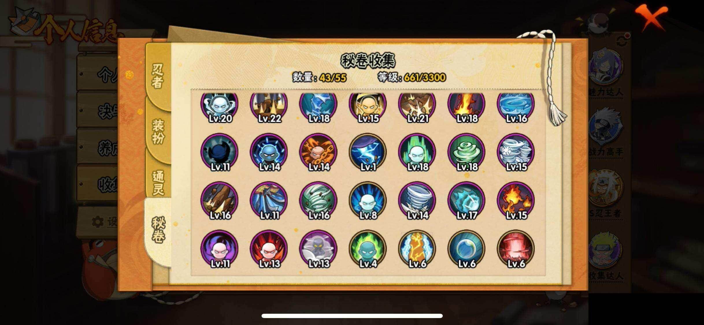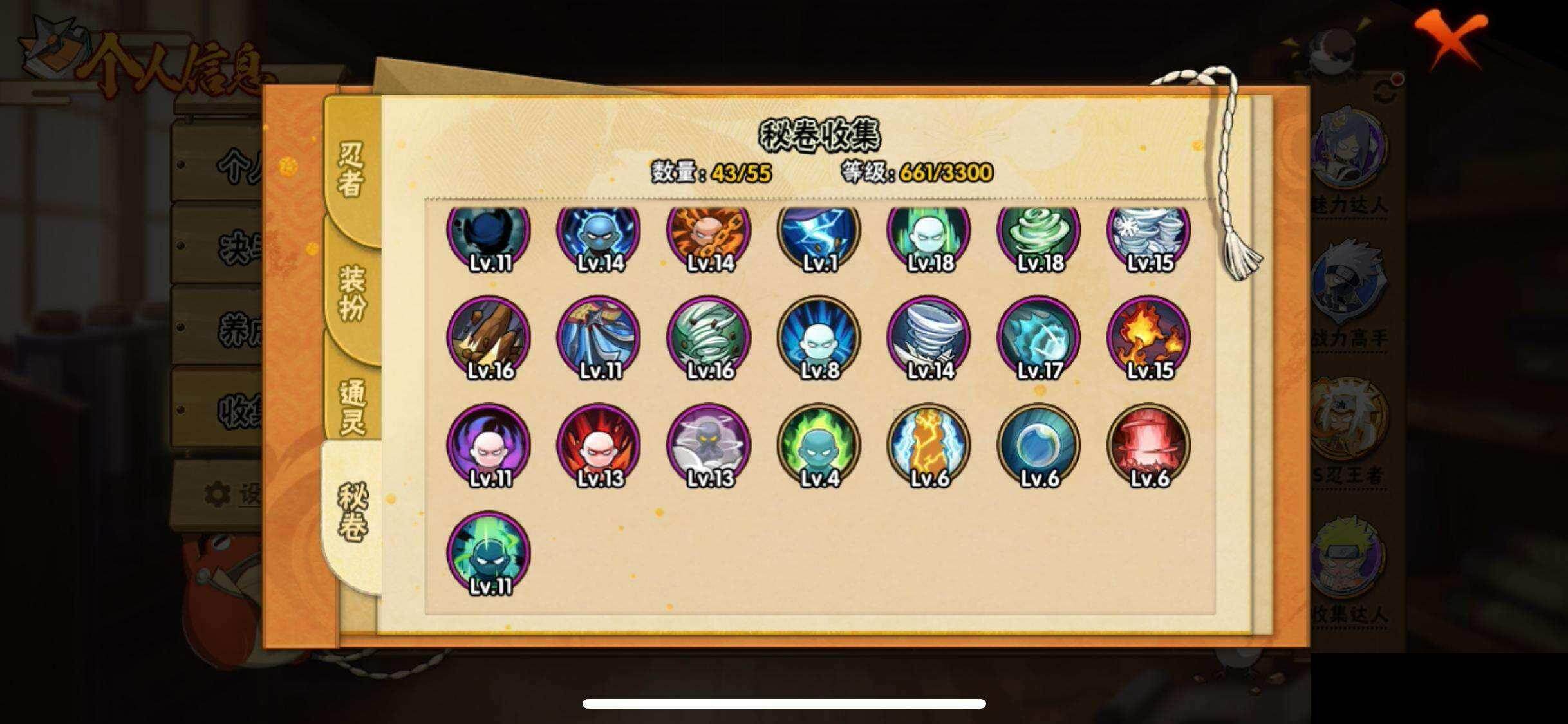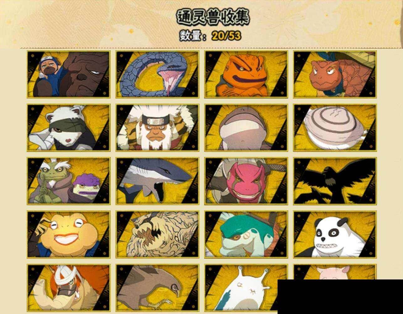 【永久通灵兽】忍犬,蓝蛇,蛤蟆吉,忍龟,镰鼬,猿魔,山椒鱼,蜃,蛤蟆仙人,鲛鲨,蛤蟆健,乌鸦,蛤蟆龙,砂之守鹤,蛤蟆广,熊猫,梦貘,鹰,蛞蝓,豚豚