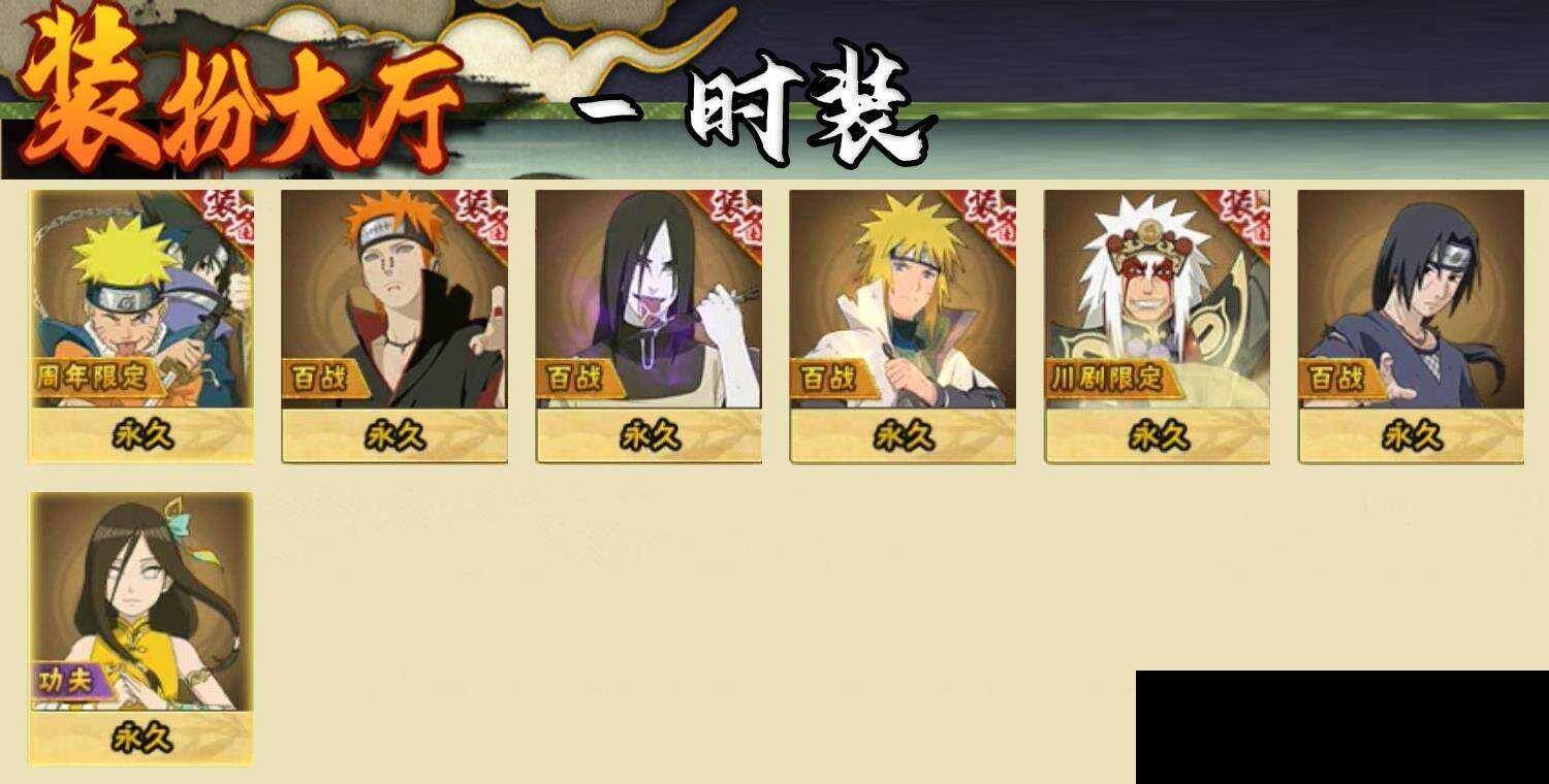 【时装】宿命连接鸣人·佐助,百战佩恩天道,百战大蛇丸,百战波风水门,蜀面豪杰自来也舞之豪杰,百