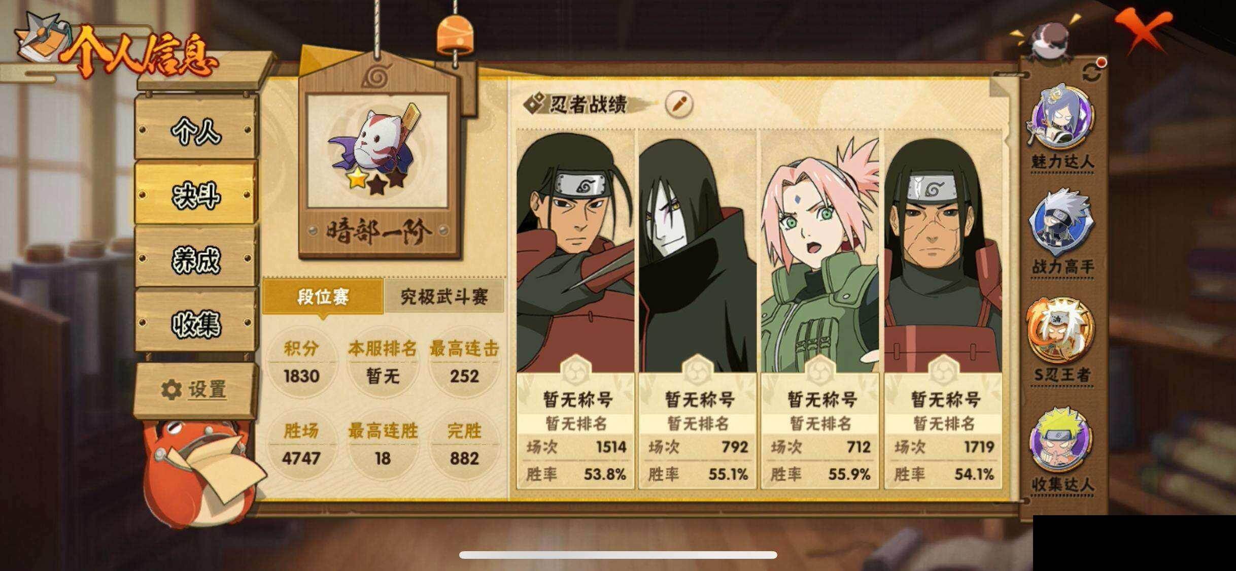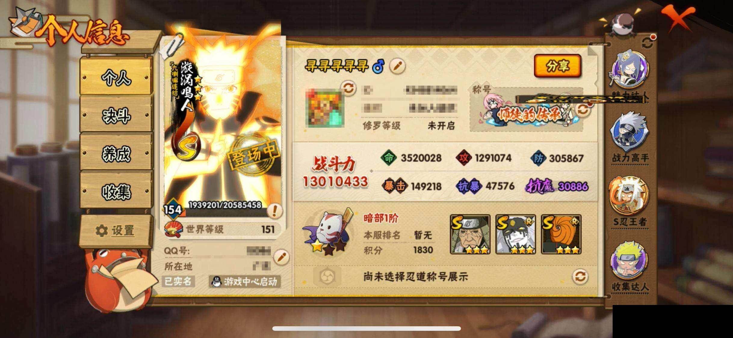 【VIP等级】10 【战力值】1301W 【段位】暗部1阶 【点券】20 【金币】750