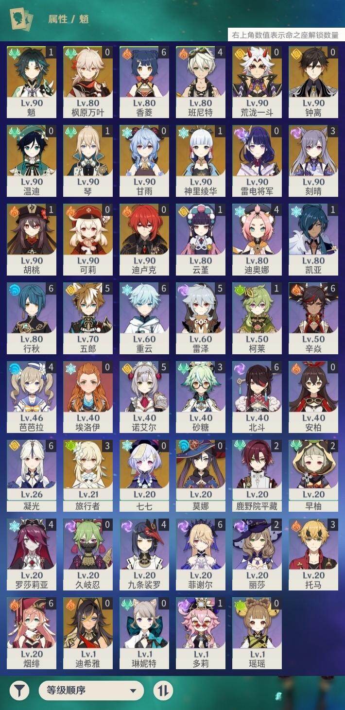 58级/29黄/女主/16个五星角色/5个五星武器0命迪希雅,0命荒泷一斗,
