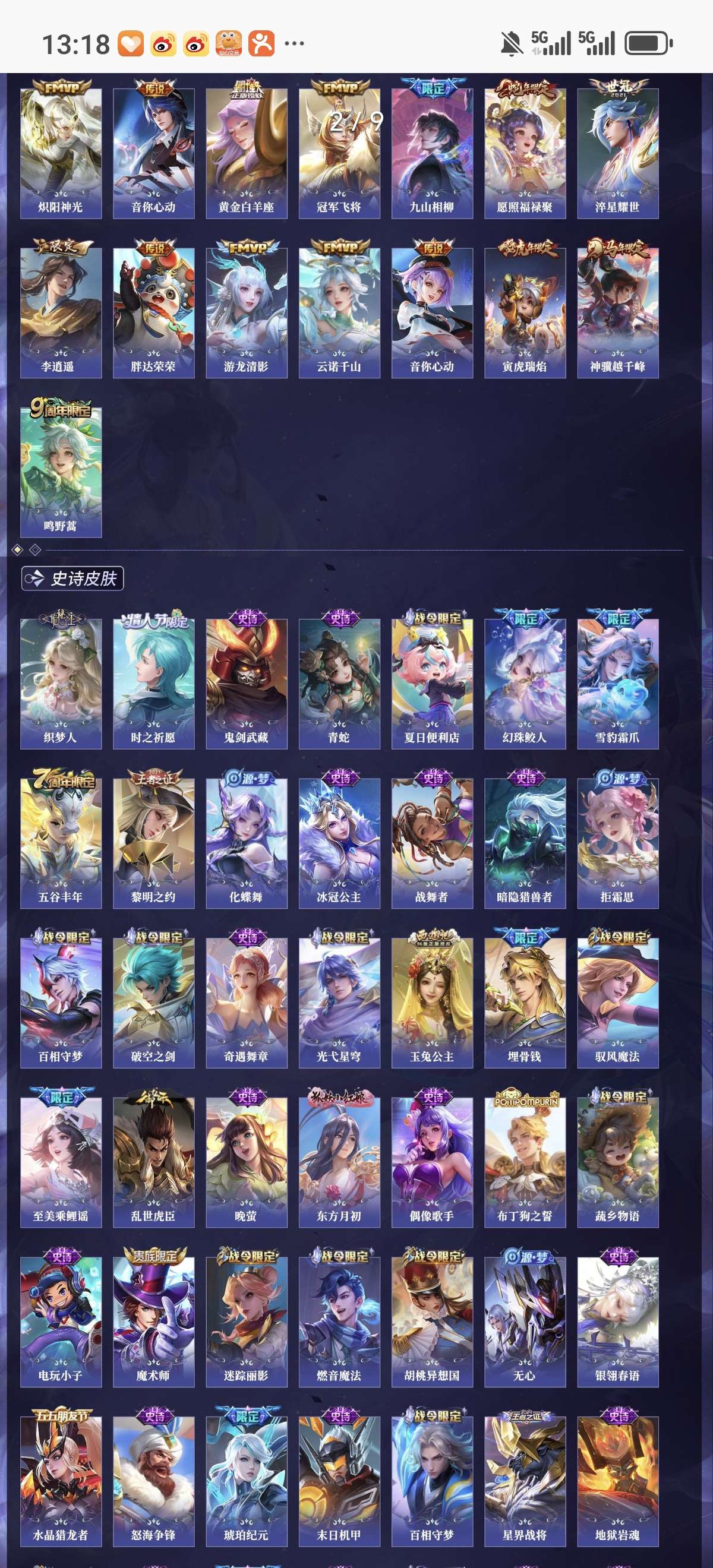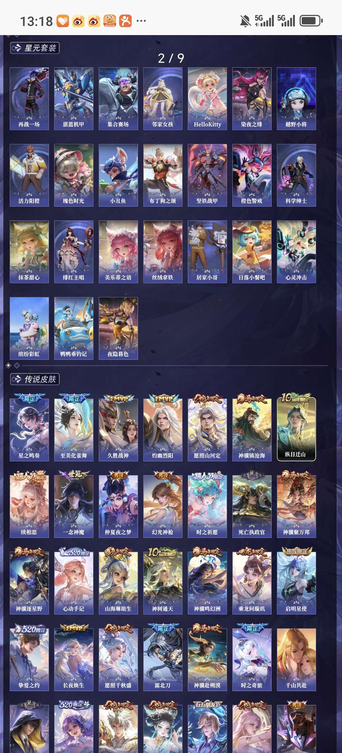 贵族9 荣耀典藏3 珍品无双1 无双8 珍品传说5 星元皮肤5 传说皮肤50
