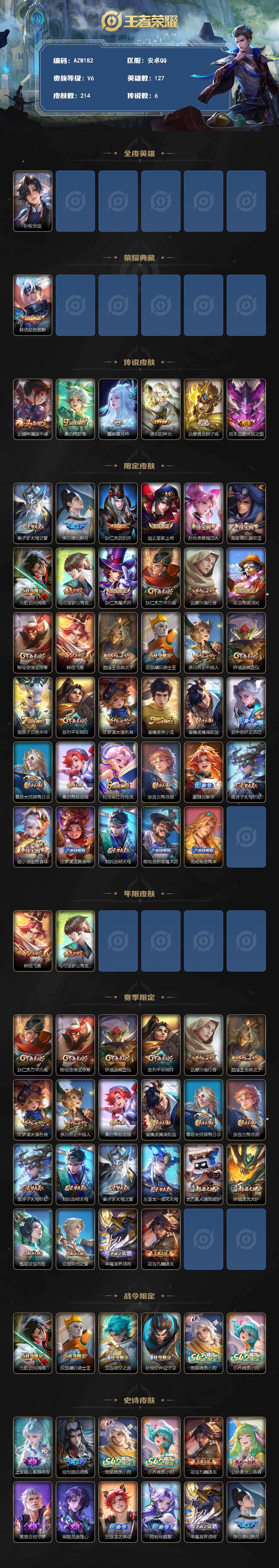 【AZW182】安卓Q-V6-最强王者段位-127英雄-214皮肤-1典藏皮肤-6传说-57史诗