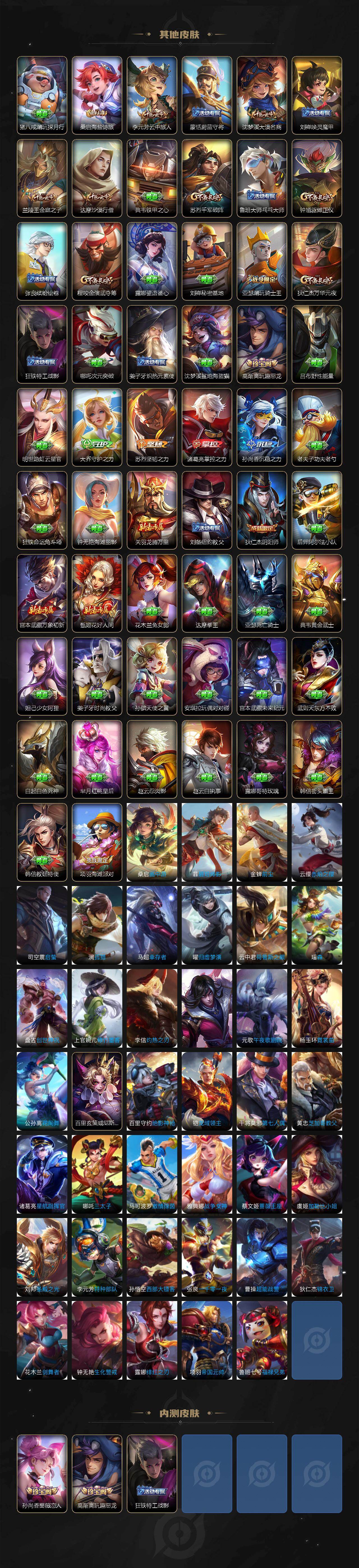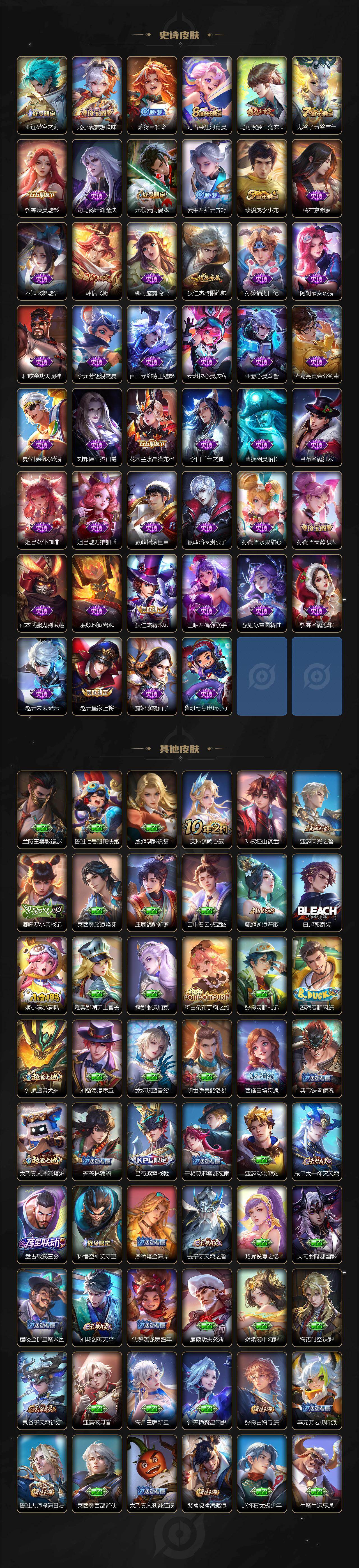 【限定皮肤】:姜子牙天穹之誓,李白谪仙醉月,狄仁杰阴阳师,赵云皇家上将,孙尚香蔷薇恋人,高渐离玩趣恶龙,元歌云间偶戏