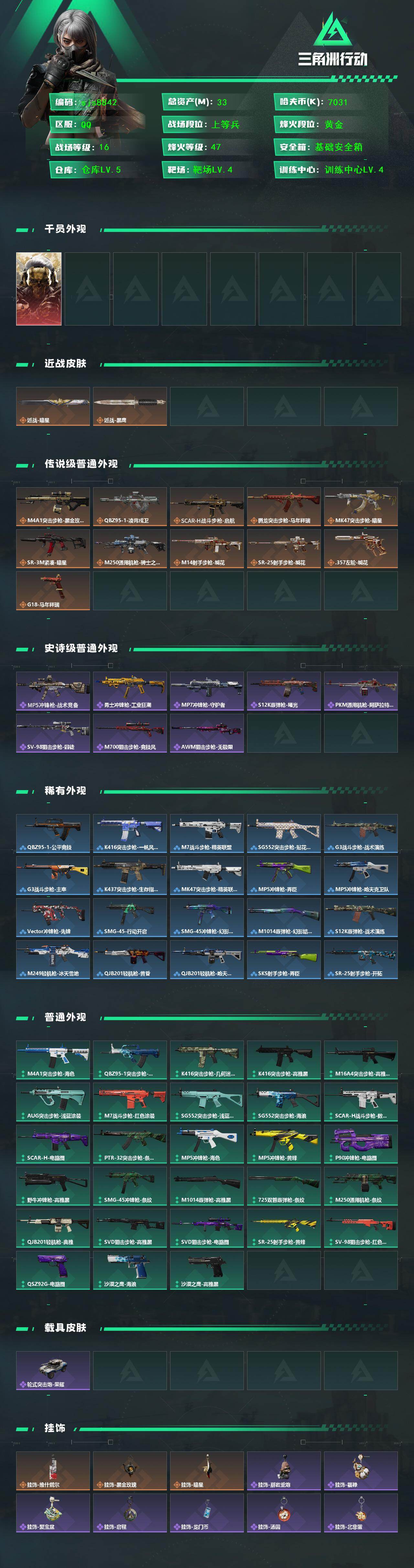 【sjs8842】红狼 暗星 烽火地带段位: 黄金 全面战场段位: 上等兵 总资产: 33000000 哈夫币: 7031000 sjs8842 干员外观: 红狼-蚀金玫瑰 传说武器皮肤: M4A1突击步枪-蚀金玫瑰,M250通用机枪-骑士之心,SCAR-H战斗步枪-启航,近战-暗星,MK47突击步枪-暗星,SR-3M紧凑突击步枪-暗星,QBZ95-1突击步枪-凌霄戍卫,腾龙突击步枪-马年祥瑞,G18-马年祥瑞,.357左轮-缄花,SR-25射手步枪-缄花,M14射手步枪-缄花 史诗武器皮肤: