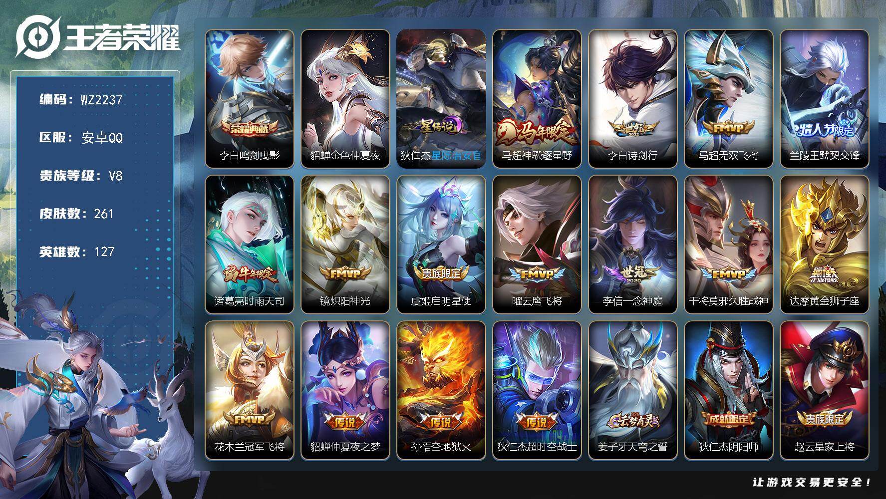 安卓Q-V8-最强王者段位-127英雄-261皮肤-1典藏皮肤-15传说-74史诗【英雄全皮】:孙权全皮【荣耀典藏】:李白鸣剑曳影【传说皮肤】:马超神骥逐星野,李白诗剑行,马超无双飞将,兰陵王默契交锋,诸葛亮时雨天司,镜炽阳神光,虞姬启明星使,曜云鹰飞将,李信一念神魔,干将莫邪久胜战神,达摩黄金狮子座,花木兰冠军飞将,貂蝉仲夏夜之梦,孙悟空地狱火,狄仁杰超时空战士【限定皮肤】:姜子牙天穹之誓,狄仁杰阴阳师,赵云皇家上将,墨子神迹守卫,嬴政优雅恋人,鲁班七号狮舞东方,庄周高山流水,高渐离死亡摇滚,