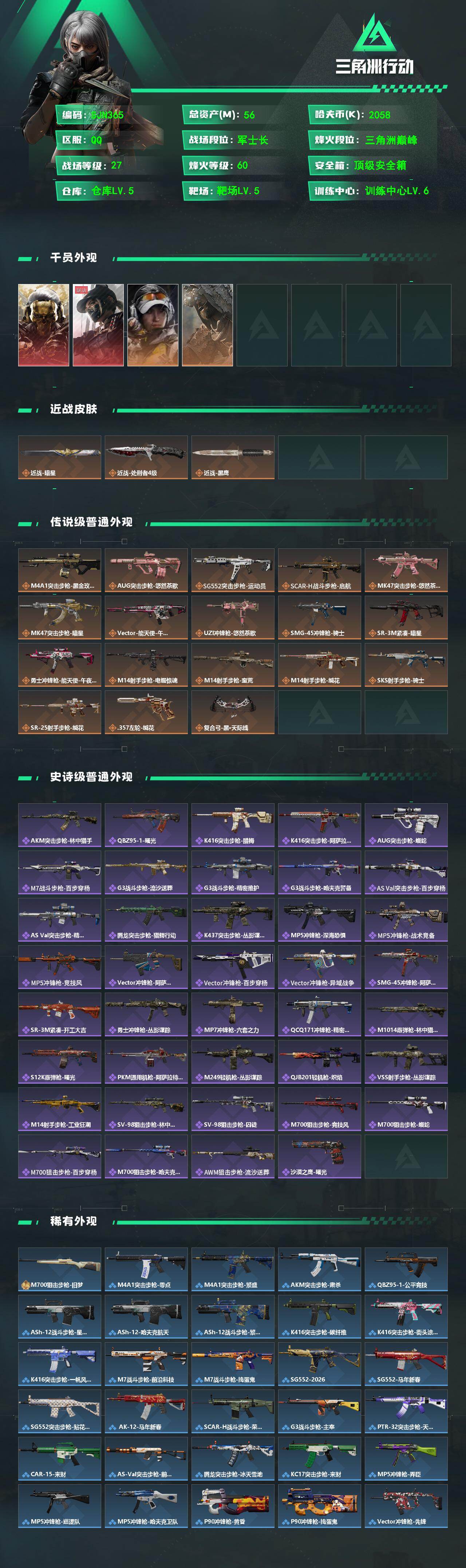 【SJN365】总资产(M):56M/哈夫币(K):2058K/哈夫币(K):2058K/传说枪皮数:18/全面战场等级:27_段位:军士长/烽火地带等级:60_段位:三角洲巅峰/红狼-蚀金玫瑰/露娜-黑·天际线/露娜-金牌射手/乌鲁鲁-荒原猎手/近战-暗星/近战-处刑者4级/近战-黑鹰/M4A1突击步枪-蚀金玫瑰/AUG突击步枪-悠然茶歇/SG552突击步枪-运动员/SCAR-H战斗步枪-启航/MK47突击步枪-悠然茶歇/MK47突击步枪-暗星/Vector冲锋枪-能天使-午夜邮差/UZI冲锋