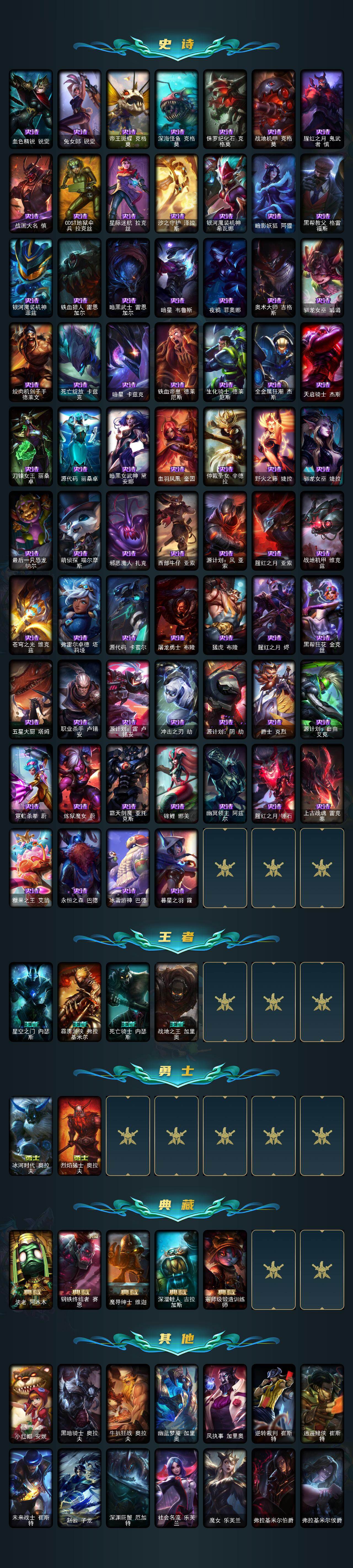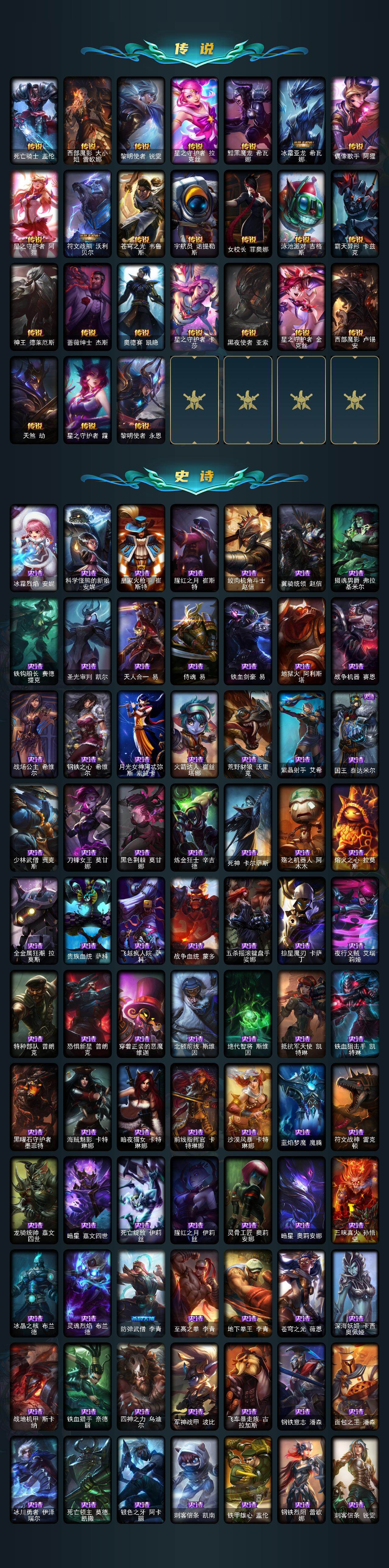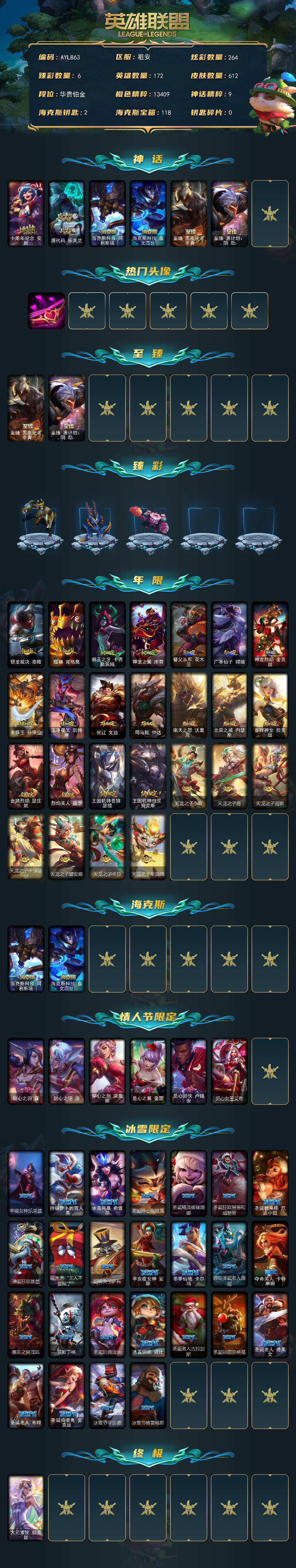 铂金段位-172英雄-612皮肤-264炫彩-1终极-6神话-127限定-59传说-144史诗