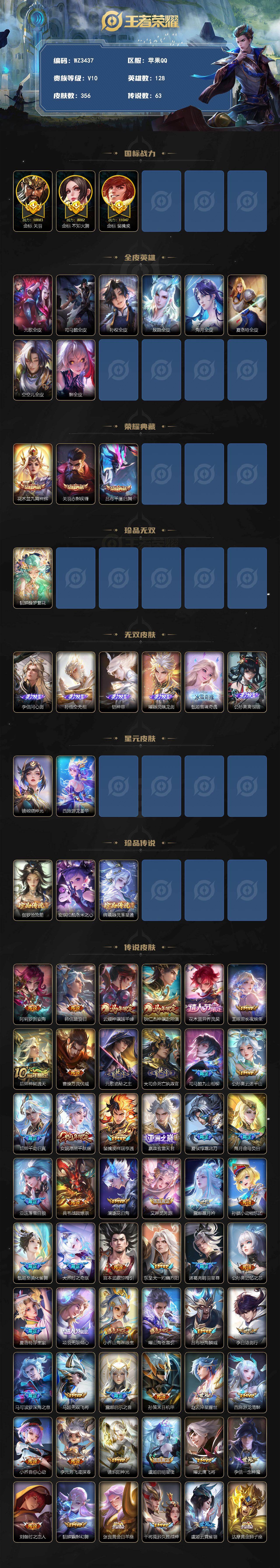 【秒换绑】苹果Q-V10-【1.1w金标裴擒虎,关羽,不知火舞】最强王者段位-128英雄-356皮肤-3典藏皮肤-1珍品无双-6无双-3珍品传说-63传说-116史诗