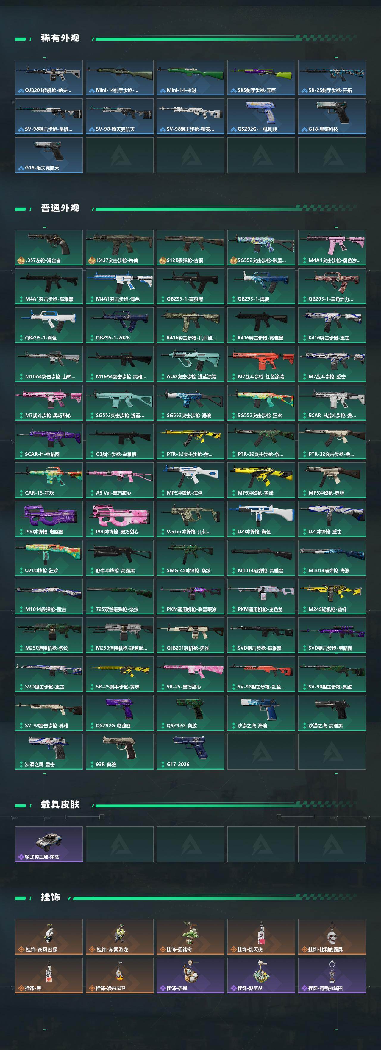 【传说外观】:M4A1突击步枪-阿米娅,AKM突击步枪-锦绣,QBZ95-1突击步枪-凌霄戍卫,ASh-12战斗步枪-鹅鸭杀,SG552突击步枪-点翠,AK-12突击步枪-特斯拉线圈,SCAR-H战斗步枪-启