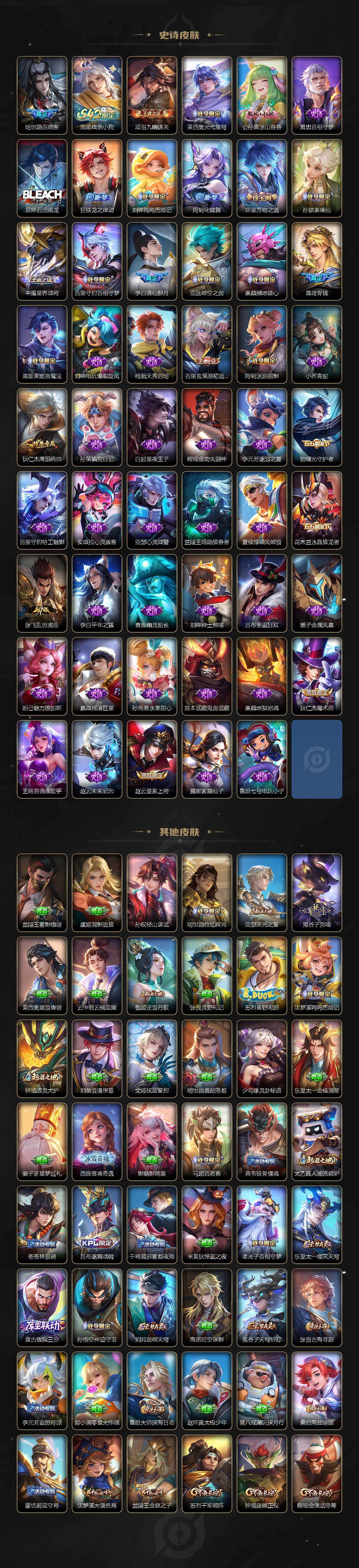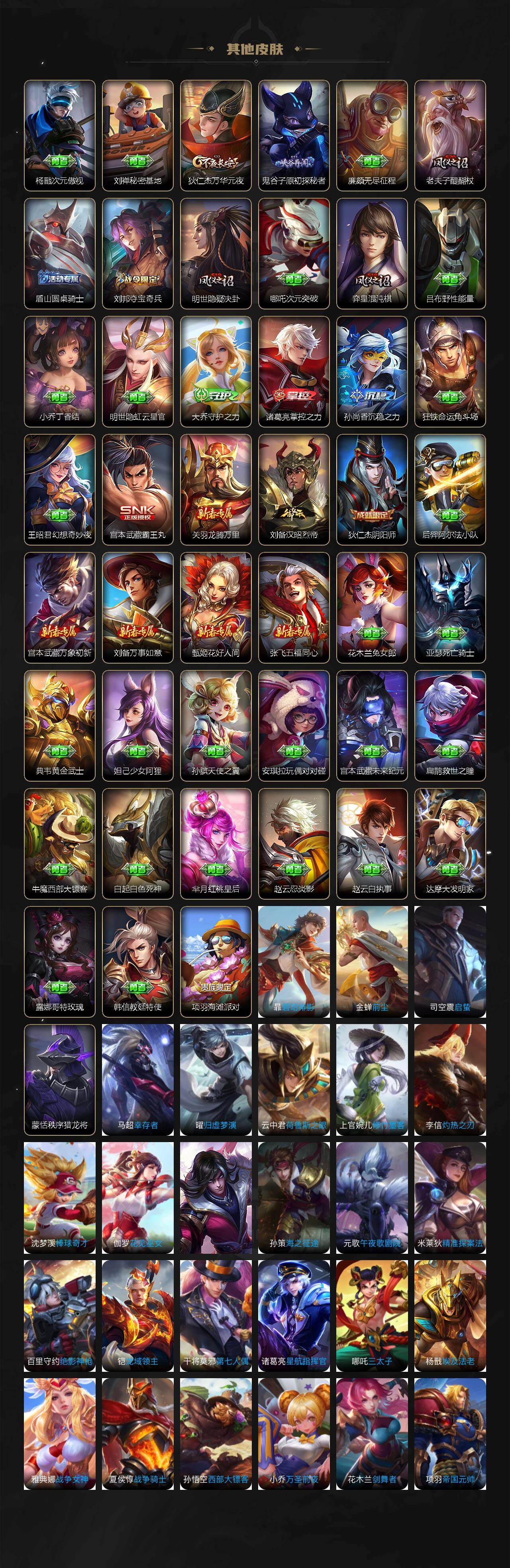 【传说皮肤】:貂蝉神骥聚万邦,马超神骥逐星野,澜愿照九州拓,云缨幻光神枪,嬴政玄雷天君,桑启鸣野蒿,百里守约碎云,王昭君乞巧织情,李信一念神魔,干将莫邪久胜战神,花