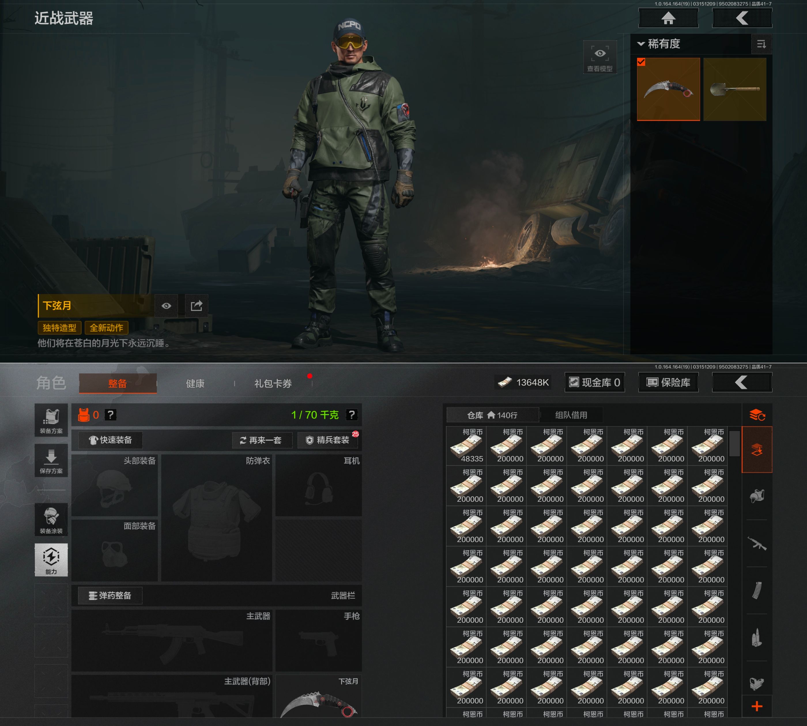 MWT4853【13.7M 下弦月】无二次包安卓Q-等级30-仓库价值13.7m-科恩币13648k-【套装】 和平先锋作战套装 财团之手作战套装 王国卫队礼装 创伤小组·后勤工作服 【枪皮】 告丧夜曲·AR57 旧王圣谕·QBZ191 旧王圣谕·VSS 【近战武器】 下弦月