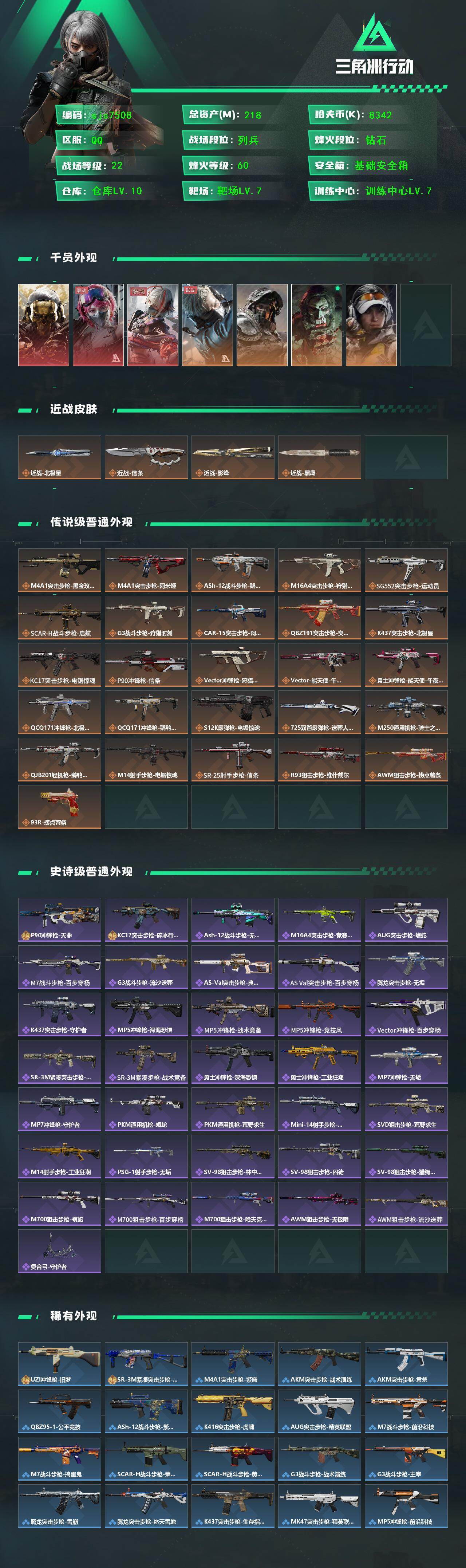 3刀3红带北极星 影锋 烽火地带段位: 钻石 全面战场段位: 列兵 总资产: 218000000 哈夫币: 8342000