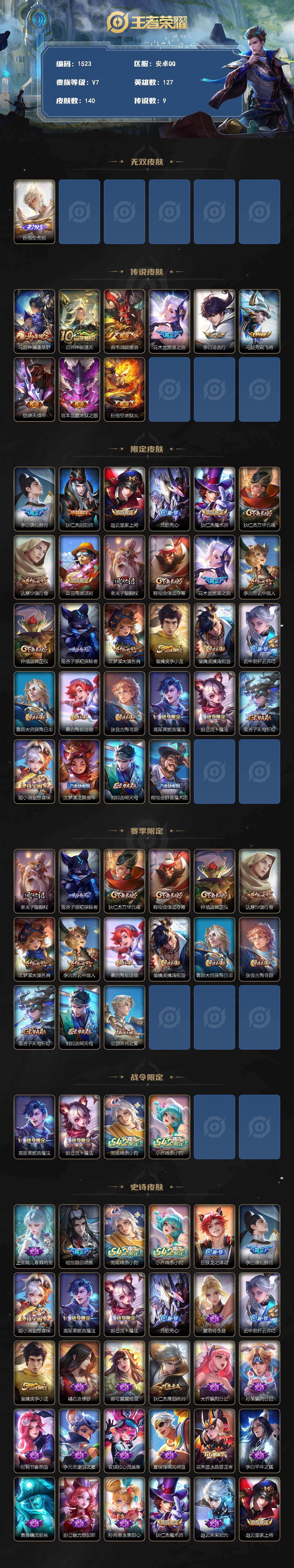 2552191 水晶211抽 安卓Q-V7-至尊星耀II段位-127英雄-140皮肤-1无双-9传说-29史诗